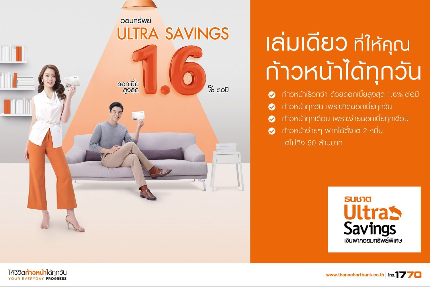 สนใจเปิดบัญชี Ultra Savings สร้างความก้าวหน้าให้เงินออม สอบถามรายละเอียดเพิ่มเติมได้ที่ธนาคารธนชาต ให้ชีวิตก้าวหน้าได้ทุกวัน โทร 1770 หรือเว็บไซต์ www.thanachartbank.co.th และ เฟซบุ๊ก www.facebook.com/ThanachartBank