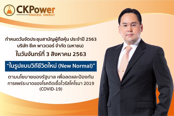 นายธนวัฒน์ ตรีวิศวเวทย์ กรรมการผู้จัดการ บริษัท ซีเค พาวเวอร์ จำกัด (มหาชน) (CKPower) ชื่อย่อหลักทรัพย์ “CKP” เปิดเผยว่า บริษัทฯ จะจัดประชุมสามัญผู้ถือหุ้นประจำปี 2563 ในวันจันทร์ที่ 3 สิงหาคม 2563 เวลา 15.00 น.ณ ห้องสุพรรณิการ์ ชั้น 4 อาคารวิริยะถาวร ถนนสุทธิสารวินิจฉัย แขวงรัชดาภิเษก เขตดินแดง กรุงเทพมหานคร ในรูปแบบวิถีชีวิตใหม่ (New Normal) ตามนโยบายของรัฐบาล เพื่อลดและป้องกันการแพร่ระบาดของโรคติดเชื้อไวรัสโคโรนา 2019 (COVID-19) โดยกำหนดให้ใช้เวลาในการจัดการประชุมไม่เกิน 1 ชั่วโมง 30 นาที รวมทั้ง จำกัดผู้เข้าร่วมประชุมจำนวน 100 ท่าน เว้นระยะห่างระหว่างที่นั่ง และต้องสวมหน้ากากอนามัยตลอดเวลา โดยจะงดการเสริมเก้าอี้และไม่อนุญาตให้ยืนระหว่างการประชุม งดใช้ไมโครโฟนเพื่อซักถามแต่ให้เขียนคำถามลงในกระดาษและจัดส่งให้เจ้าหน้าที่ โดยกำหนดให้ผู้ถือหุ้นสอบถามเฉพาะประเด็นที่เกี่ยวกับวาระที่มีการลงคะแนนเสียงเท่านั้น เพื่อหลีกเลี่ยงการอยู่ในสถานที่ประชุมเป็นเวลานาน อย่างไรก็ตาม ผู้ถือหุ้นที่ไม่สามารถเข้าร่วมประชุมได้ เนื่องจากสถานที่ประชุมรองรับได้ไม่เกิน 100 ท่าน สามารถมอบฉันทะให้กรรมการอิสระ เพื่อแสดงความประสงค์การลงคะแนนพร้อมส่งแบบคำถามได้ สำหรับผู้รับมอบฉันทะที่ไม่ได้รับอนุญาตให้เข้าร่วมการประชุมสามารถส่งคำถามให้กับเจ้าหน้าที่บริษัทได้เช่นกัน