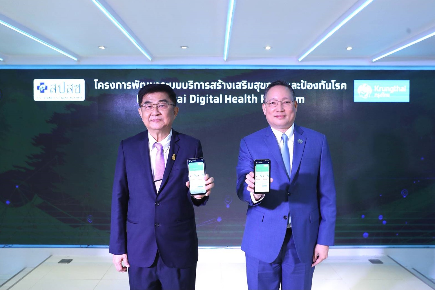 นายแพทย์ศักดิ์ชัย กาญจนวัฒนา เลขาธิการสำนักงานหลักประกันสุขภาพแห่งชาติ (สปสช.) นายผยง ศรีวณิช กรรมการผู้จัดการใหญ่ ธนาคารกรุงไทย ร่วมแถลงข่าว โครงการพัฒนาระบบบริการสร้างเสริมสุขภาพและป้องกันโรค ด้วย Krungthai Digital Health Platform ที่ Krungthai Innovation Lab อาคารสำนักงานใหญ่