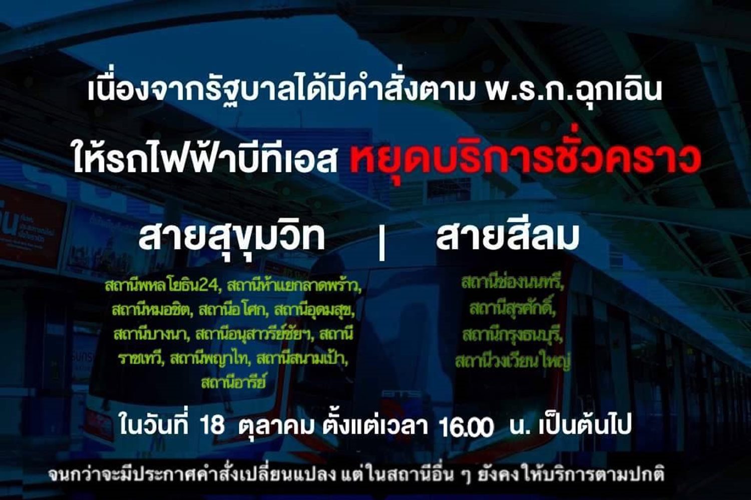 รายงานข่าวจากบริษัท ระบบขนส่งมวลชนกรุงเทพ จำกัด (มหาชน) หรือผู้ให้บริการรถไฟฟ้าบีทีเอส ขอแจ้งว่า เนื่องจากรัฐบาลได้มีคำสั่งตามประกาศสถานการณ์ฉุกเฉิน ที่มีความร้ายแรงในเขตท้องที่กรุงเทพมหานคร คำสั่งหัวหน้าผู้รับผิดชอบในการแก้ไขสถานการณ์ฉุกเฉินที่มีความร้ายแรง กำหนดห้ามการใช้เส้นทางคมนาคม อาคาร หรือสถานที่ต่างๆ คำสั่ง ณ วันที่ 18 ตุลาคม 2563