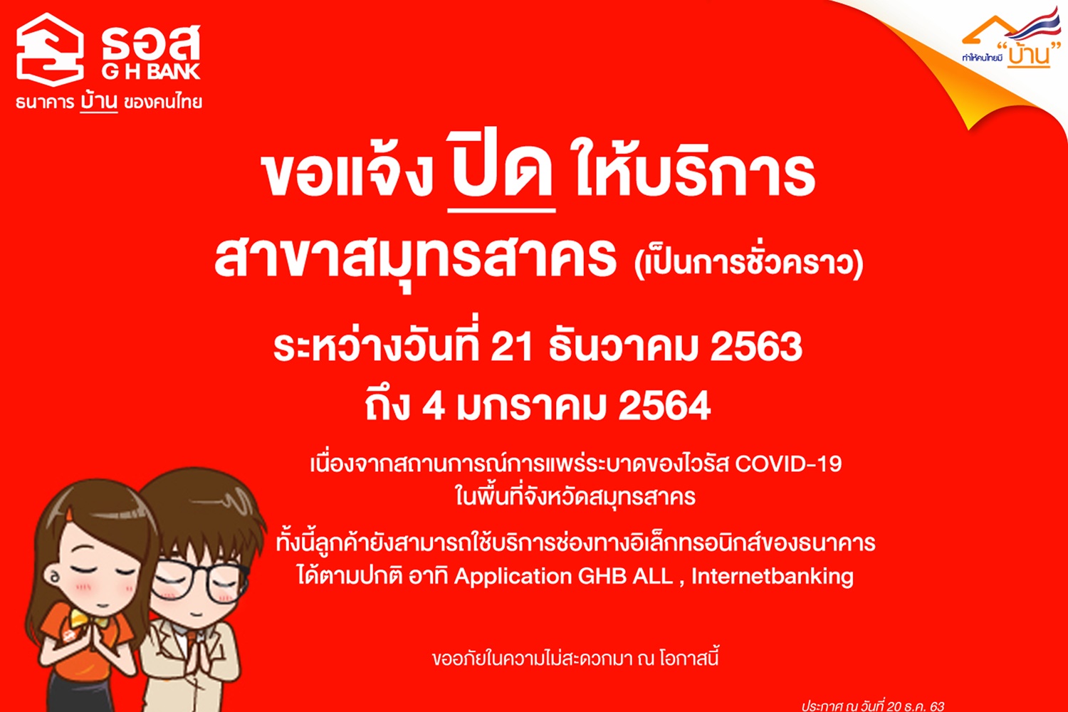 ธนาคารอาคารสงเคราะห์ (ธอส.) แจ้งปิดการให้บริการธุรกรรมทางการเงินทุกประเภท ที่สาขาสมุทรสาคร ตั้งอยู่บนถนนเศรษฐกิจ 1 ตำบลท่าทราย อำเภอเมืองสมุทรสาคร จังหวัดสมุทรสาครเป็นการชั่วคราว ในระหว่างวันที่ 21 ธันวาคม 2563 - 4 มกราคม 2564 เพื่อความปลอดภัยและป้องกันความเสี่ยงด้านสุขภาพของลูกค้าจากปัญหาการแพร่ระบาดของโควิด-19 ในพื้นที่จังหวัดสมุทรสาคร