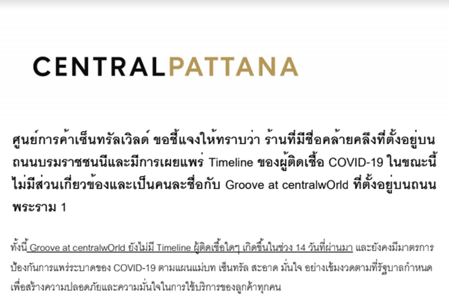 ศูนย์การค้าเซ็นทรัลเวิลด์ ชี้แจง ร้านที่มีชื่อคล้ายคลึงที่ตั้งอยู่บนถนนบรมราชชนนีและมีการเผยแพร่ Timeline ของผู้ติดโควิดไม่มีส่วนเกี่ยวข้องและเป็นคนละชื่อกับ Groove at centralwOrld