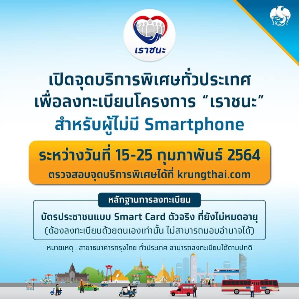นายผยง ศรีวณิช กรรมการผู้จัดการใหญ่ ธนาคารกรุงไทย เปิดเผยว่า การลงทะเบียนโครงการเราชนะของกลุ่มที่ต้องการความช่วยเหลือเป็นพิเศษ เช่น ไม่สามารถเข้าถึงระบบอินเตอร์เน็ต ไม่มีสมาร์ทโฟน ไม่สามารถเข้าแอปพลิเคชันเป๋าตัง อยู่ในภาวะพึ่งพิง ผู้สูงอายุ ผู้พิการ ผู้ป่วยติดเตียง เป็นต้น สามารถลงทะเบียน 15-25 ก.พ. 2564 ที่สาขาธนาคารกรุงไทยทั่วประเทศ หรือจุดบริการเคลื่อนที่รับลงทะเบียน โดยสามารถใช้จ่ายเงินผ่านบัตรประชาชนได้ในวันที่ 5 มี.ค. 2564 โดยใช้ผ่านเครื่องรูดอีดีซี และ แอปพลิเคชั่นเป๋าเงิน