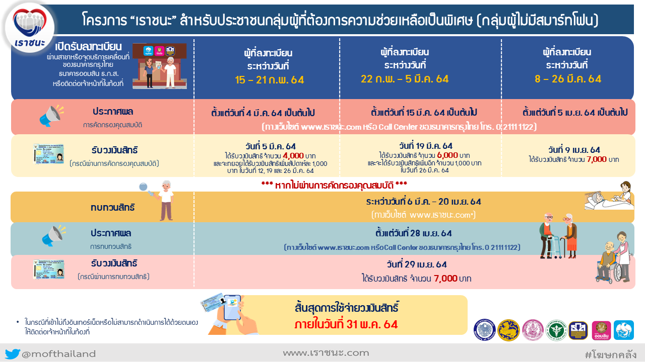 นางสาวกุลยา ตันติเตมิท ผู้อำนวยการสำนักงานเศรษฐกิจการคลัง (สศค.) ในฐานะโฆษกกระทรวงการคลังเปิดเผยความคืบหน้าเกี่ยวกับการขยายระยะเวลาเปิดรับลงทะเบียนเข้าร่วมโครงการเราชนะ (โครงการฯ) สำหรับประชาชนกลุ่มผู้ที่ต้องการความช่วยเหลือเป็นพิเศษ (กลุ่มผู้ไม่มีสมาร์ทโฟน) ระหว่างวันที่ 8 – 26 มีนาคม 2564 ว่าประชาชนที่ลงทะเบียนเข้าร่วมโครงการฯ ในช่วงเวลาดังกล่าว จะทราบผลการคัดกรองคุณสมบัติได้ตั้งแต่วันที่ 5 เมษายน 2564 เป็นต้นไปโดยผู้ผ่านการคัดกรองคุณสมบัติจะได้รับการโอนวงเงินสิทธิ์ จำนวน 7,000 บาทและสามารถใช้จ่ายวงเงินสิทธิ์ผ่านบัตรประชาชนแบบอเนกประสงค์ (Smart Card) ได้ที่ผู้ประกอบการร้านค้าหรือผู้ให้บริการที่เข้าร่วมโครงการฯ ตั้งแต่วันที่ 9 เมษายน – 31 พฤษภาคม 2564