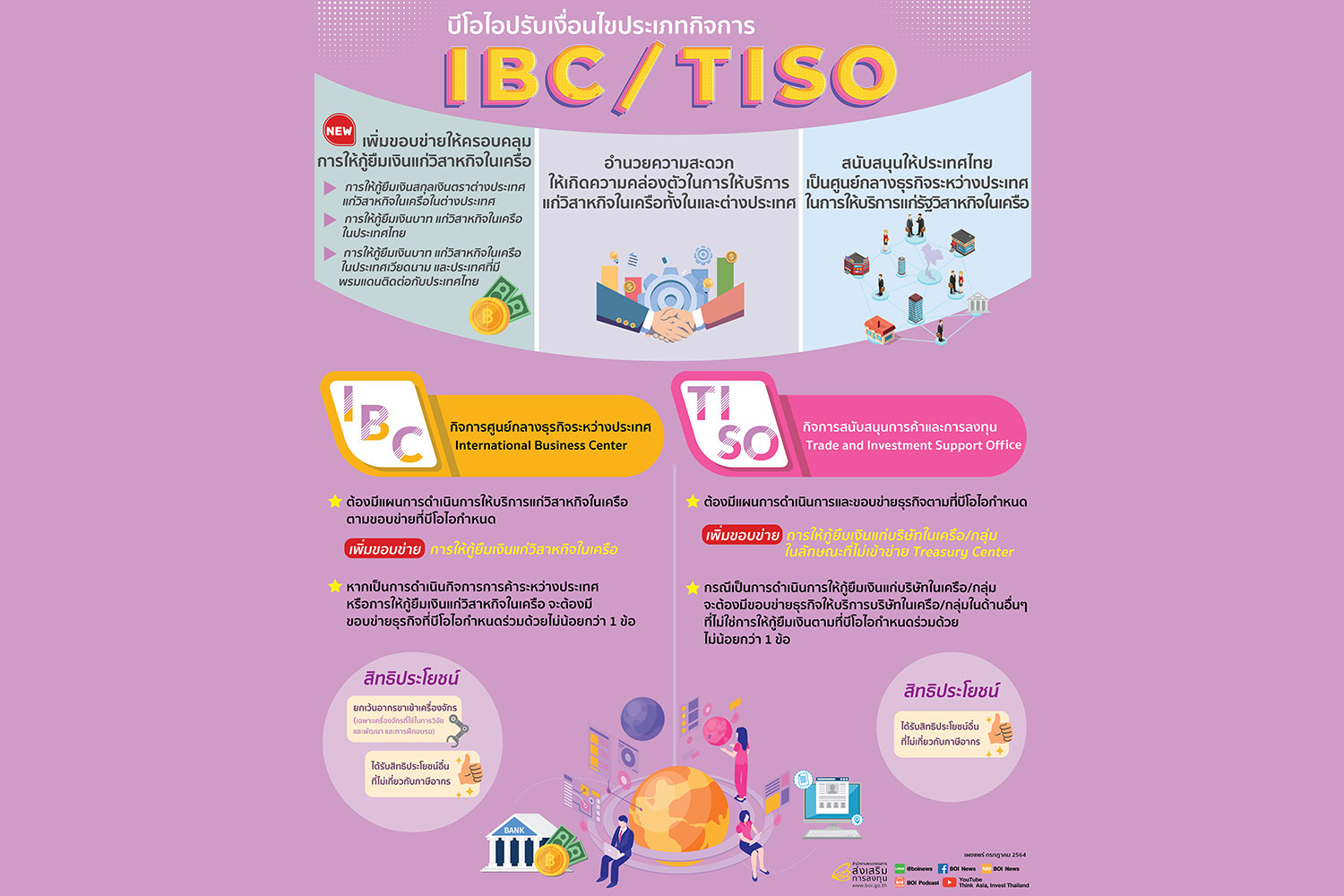สำนักงานคณะกรรมการส่งเสริมการลงทุน หรือ บีโอไอ ได้ปรับเงื่อนไขประเภทกิจการ IBC/TISO โดยเพิ่มขอบข่ายให้ครอบคลุมการให้กู้ยืมเงินแก่วิสาหกิจในเครือ เพื่ออำนวยความสะดวกให้เกิดความคล่องตัวในการให้บริการแก่วิสาหกิจในเครือทั้งในและต่างประเทศ และเพื่อสนับสนุนให้ประเทศเป็น “ศูนย์กลางธุรกิจระหว่างประเทศ” ในการให้บริการแก่รัฐวิสาหกิจในเครือ