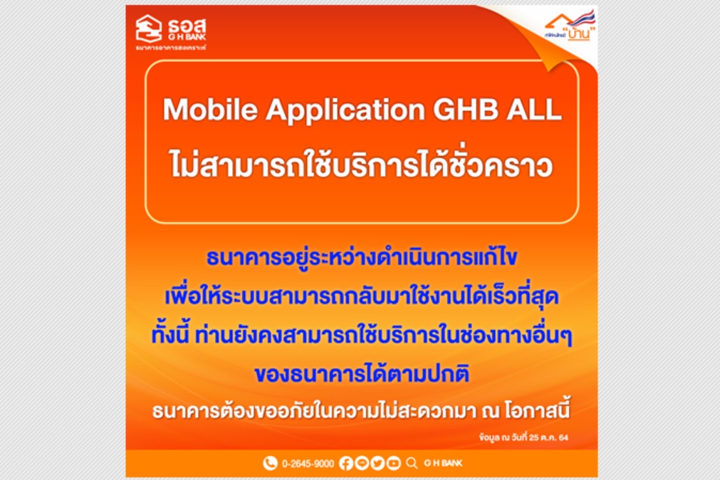 ธนาคารอาคารสงเคราะห์ (ธอส.) แจ้งกรณีที่ในวันนี้ (วันจันทร์ที่ 25 ตุลาคม 2564) ระบบ Application : GHB ALL เกิดความขัดข้อง ส่งผลให้ลูกค้าไม่สามารถเข้าใช้บริการ Application : GHB ALL ได้เป็นการชั่วคราว