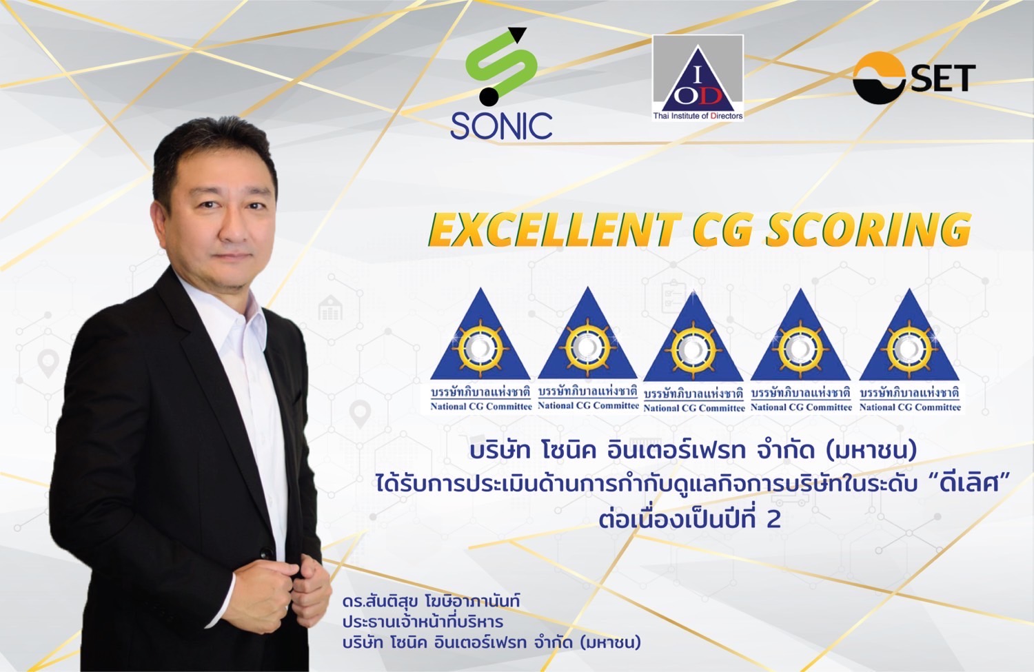 ดร.สันติสุข โฆษิอาภานันท์ ประธานเจ้าหน้าที่บริหาร บริษัทโซนิค อินเตอร์เฟรท จำกัด (มหาชน) หรือ SONIC กล่าวว่า บริษัทได้รับผลประเมินในการจัดอันดับอยู่ในระดับดีเลิศ (Excellent CG Scoring) หรือ 5 ดาว ในโครงการสำรวจการกำกับดูแลกิจการบริษัทจดทะเบียน ( Corporate Governance Report : CGR ) ประจำปี 2564 ที่จัดโดยสมาคมส่งเสริมสถาบันกรรมการบริษัทไทย ( Thai Institute of Directors : IOD ) และตลาดหลักทรัพย์แห่งประเทศไทย ( ตลท.)