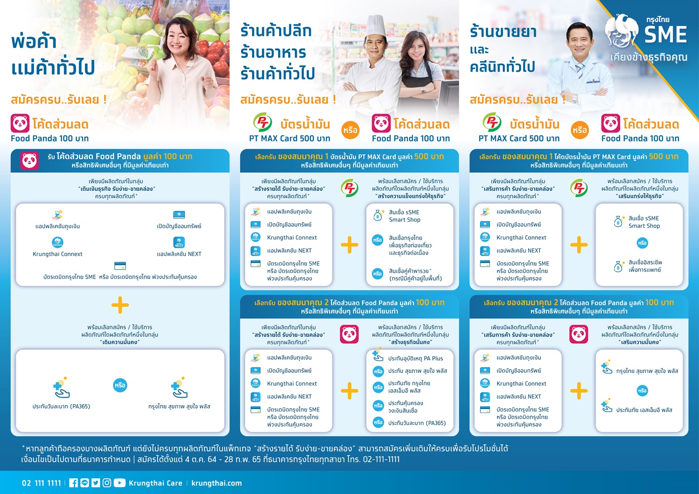 ล่าสุด ธนาคารได้จัดแคมเปญ “SME Solutions” มอบสิทธิพิเศษให้ผู้ประกอบการร้านค้ารายย่อย เพียงใช้บริการแอปฯ ถุงเงิน พร้อม Krungthai NEXT บริการ Krungthai Connext และบัตรเดบิตกรุงไทย SME หรือบัตรเดบิตกรุงไทย ร่วมกับผลิตภัณฑ์ใดผลิตภัณฑ์หนึ่งในกลุ่มสินเชื่อ รับโค้ดบัตรน้ำมัน PT MAX Card มูลค่า 500 บาท หรือร่วมกับซื้อผลิตภัณฑ์ประกัน รับโค้ดส่วนลด foodpanda มูลค่า 100 บาท หรืออื่นๆ ที่มีมูลค่าเทียบเท่าตามเงื่อนไขที่ธนาคารกำหนด