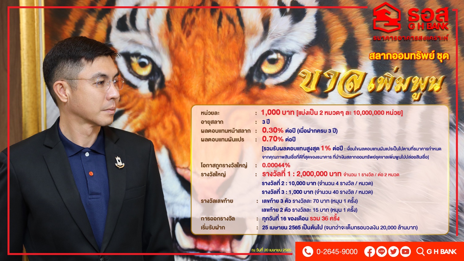 สำหรับสลากออมทรัพย์ชุดขาลเพิ่มพูน จะเริ่มรับฝากตั้งแต่วันจันทร์ที่ 25 เมษายน 2565 เป็นต้นไป จนกว่าจะเต็มกรอบวงเงิน และเริ่มออกรางวัลครั้งแรกวันจันทร์ที่ 16 พฤษภาคม 2565 ผู้ที่สนใจสามารถฝากได้ที่ Mobile Application : GHB ALL หรือที่สาขาของธนาคารทุกแห่งทั่วประเทศ สอบถามรายละเอียดเพิ่มเติมได้ที่ ธอส. ทุกสาขาทั่วประเทศ หรือ G H Bank Call Center โทร 0-2645-9000 หรือ Facebook Fanpage ธนาคารอาคารสงเคราะห์ และ ติดตามข้อมูลข่าวสารได้ที่ Application : GHB ALL และ www.ghbank.co.th