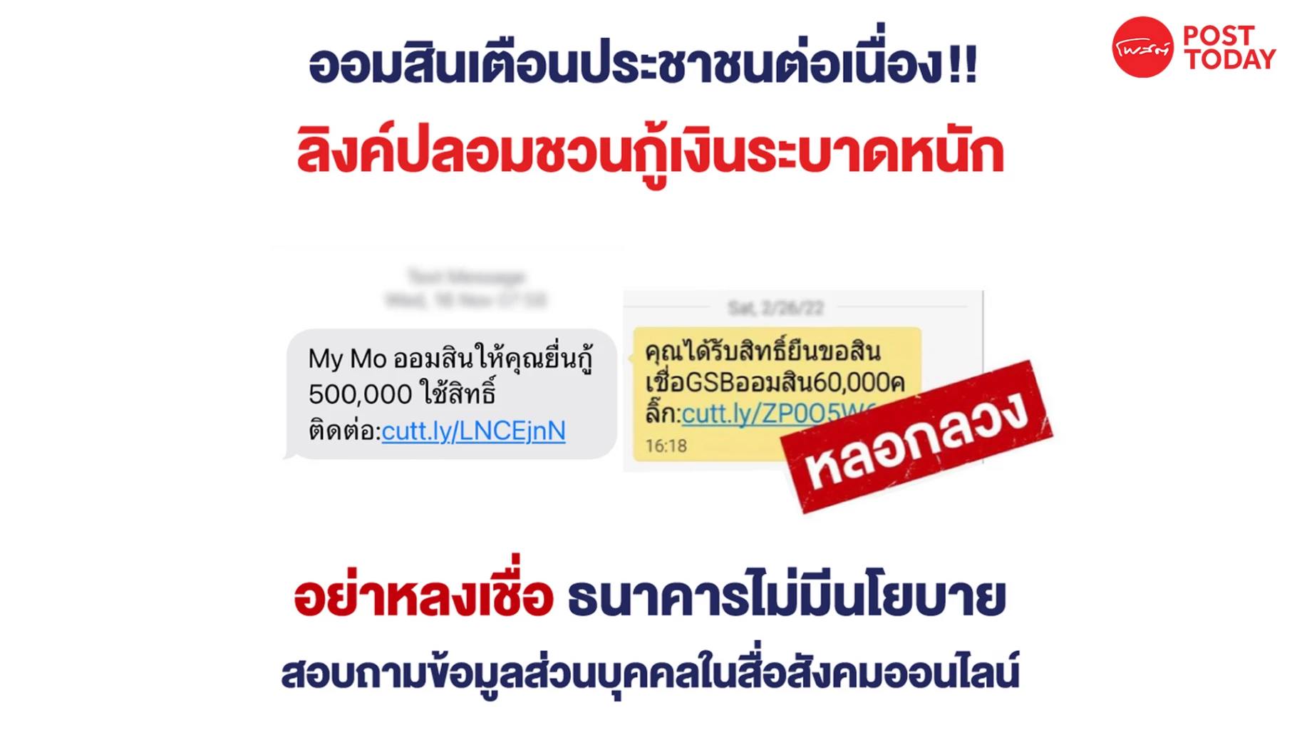 รายงานข่าวจากธนาคารออมสิน แจ้งเตือน ขณะนี้ได้มีกลุ่มมิจฉาชีพแอบอ้างใช้ชื่อ "สินเชื่อGSBออมสิน" "My Mo ออมสิน" ตลอดทั้งใช้โลโก้ธนาคาร ส่งข้อความในรูปแบบลิงก์ SMS Line หรือ Facebook เข้ามือถือของลูกค้าและประชาชนจำนวนมาก โดยใช้ข้อความเชิญชวนลักษณะกระตุ้นให้กดรับสิทธิหรือกดลิงก์เข้าไป ทั้งนี้ ลิงก์ข้อความดังกล่าวไม่ใช่ของธนาคารออมสิน ขอให้ลูกค้าและประชาชนอย่าหลงเชื่อ ไม่กดลิงก์ และไม่เพิ่มเพื่อน หรือกรอกข้อความใดๆ เด็ดขาด เพิ่มความระมัดระวังมากยิ่งขึ้น และขอย้ำว่าธนาคารไม่มีนโยบายสอบถามข้อมูลส่วนบุคคลจากลูกค้าในสื่อสังคมออนไลน์