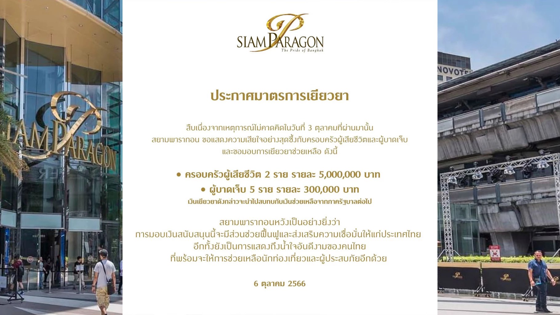 "สยามพารากอน"ประกาศมาตรการเยียวยาผู้เสียชีวิต บาดเจ็บ เหตุกราดยิง 3ต.ค.66 รวม11,500,000 บาทและแสดงความเสียใจอย่างสุดซึ้ง