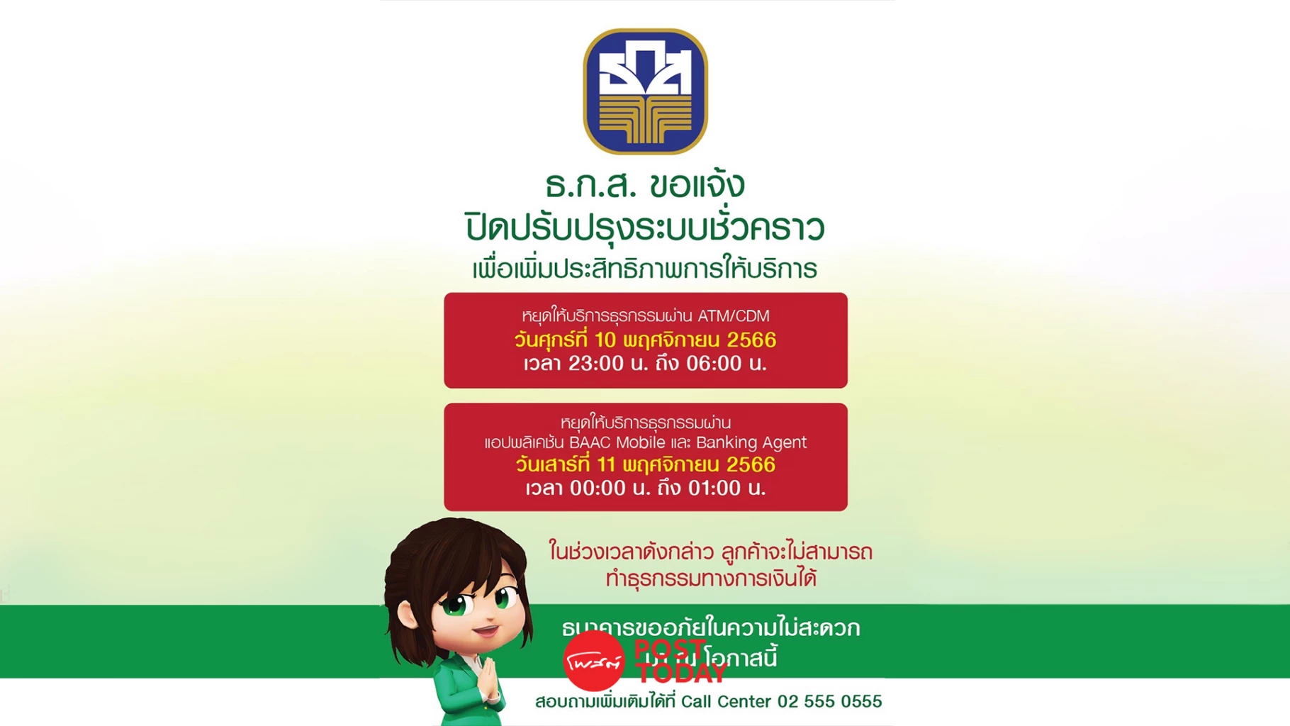 ธ.ก.ส. แจ้งปิดปรับปรุงระบบธุรกรรมชั่วคราว 7 ชั่วโมง ในวันที่ 10 พ.ย. 66 เวลา 23:00 น. ถึงวันที่ 11 พ.ย. 66 เวลา 06:00 น.