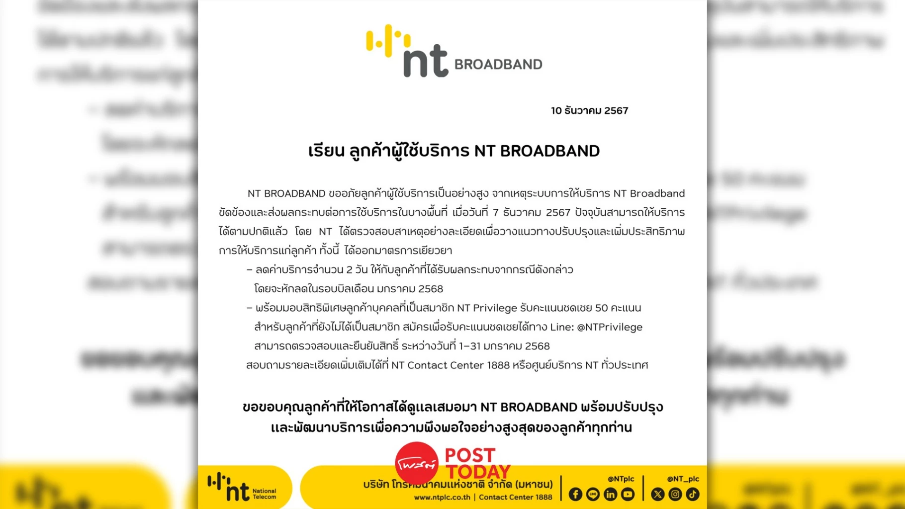 ทั้งนี้ NT ได้ออกมาตรการเยียวยาลดค่าบริการจำนวน 2 วันให้กับลูกค้าที่ได้รับผลกระทบจากกรณีดังกล่าว โดยจะหักลดในรอบบิลเดือน มกราคม 2568 พร้อมมอบสิทธิพิเศษลูกค้าบุคคลที่เป็นสมาชิก NT Privilege รับคะแนนชดเชย 50 คะแนน