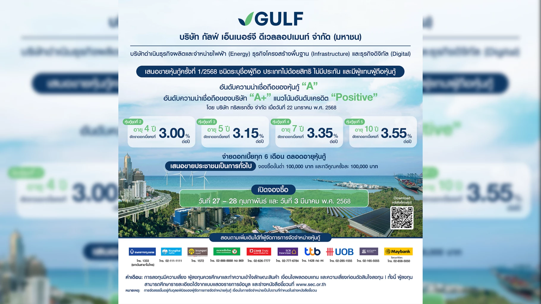 GULF เคาะแล้ว! อัตราดอกเบี้ยหุ้นกู้อายุ 4-10 ปี ที่ 3.00 – 3.55% ต่อปี พร้อมเสนอขายประชาชนทั่วไป 27-28 ก.พ. และ 3 มี.ค.68 ผ่านสถาบันการเงินชั้นนำ 10 แห่ง