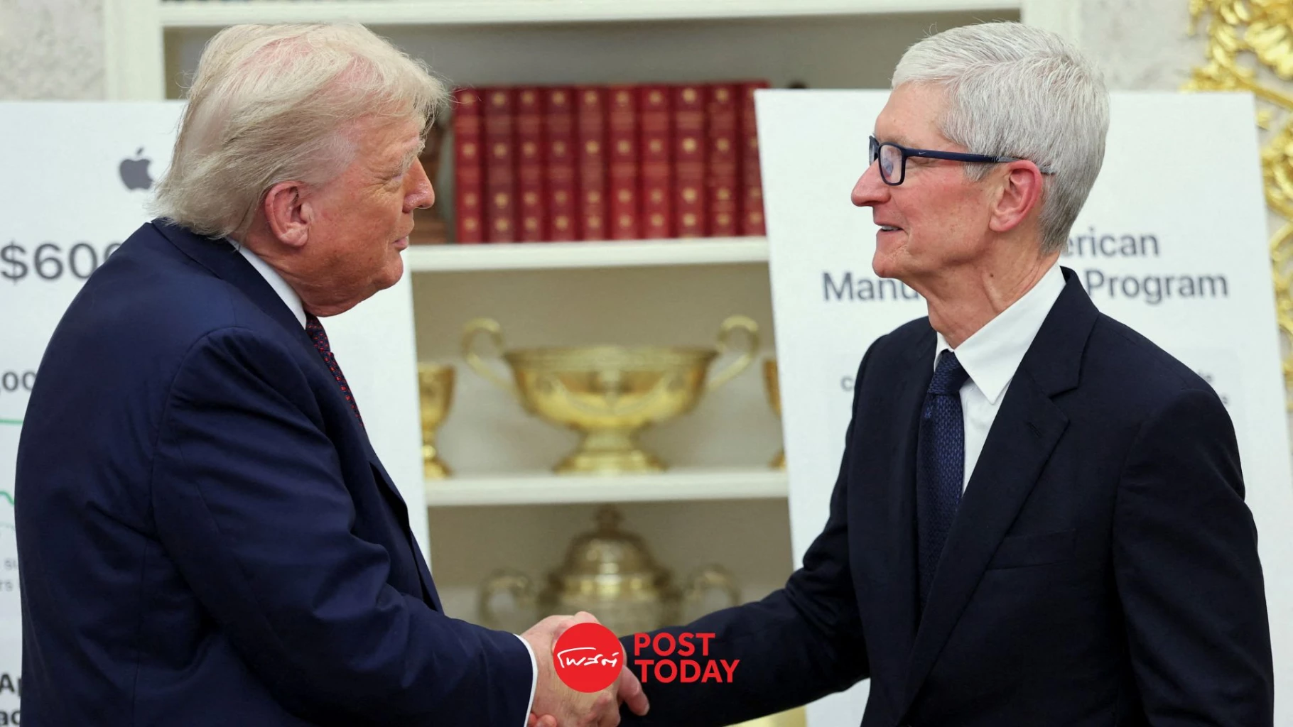 ในบรรยากาศของห้องทำงานรูปไข่ ณ ทำเนียบขาว เมื่อวันพุธ ทิม คุก ได้ประกาศต่อหน้าประธานาธิบดีทรัมป์ และรองประธานาธิบดี เจดี แวนซ์ ว่า