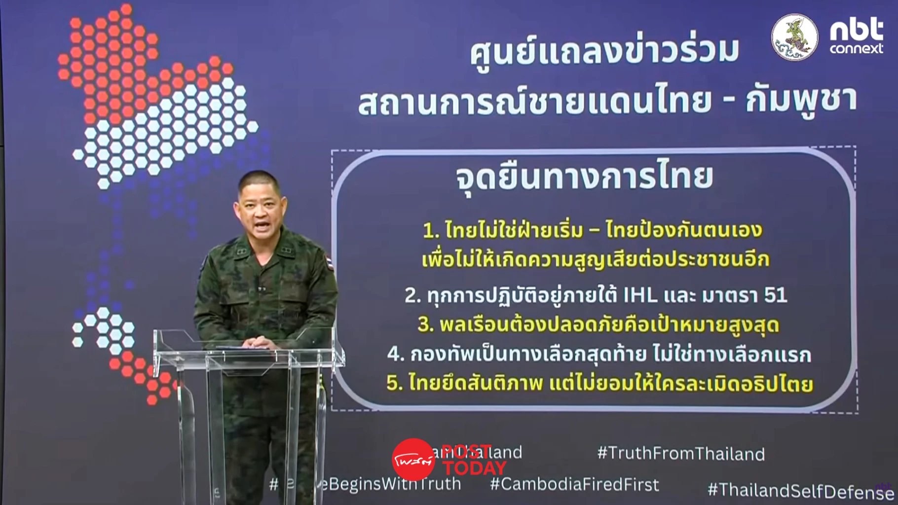 ศูนย์แถลงข่าวร่วมสถานการณ์ชายแดนไทย-กัมพูชานำเสนอภาพรวมสถานการณ์ล่าสุด พร้อมย้ำว่าทุกการเคลื่อนไหวของไทยตั้งอยู่บนเป้าหมายเดียว การปกป้องอธิปไตยและความปลอดภัยของประชาชน ไม่ใช่การเปิดฉากโจมตี ตามที่ฝ่ายกัมพูชากล่าวอ้างก่อนหน้านี้ การแถลงข่าวต่อไปจะมีผู้แทนกองทัพ สตช. และกระทรวงการต่างประเทศขึ้นชี้แจงรายละเอียดโดยตรง เพื่อให้ข้อมูลครบชัดเจนที่สุดต่อสาธารณะ