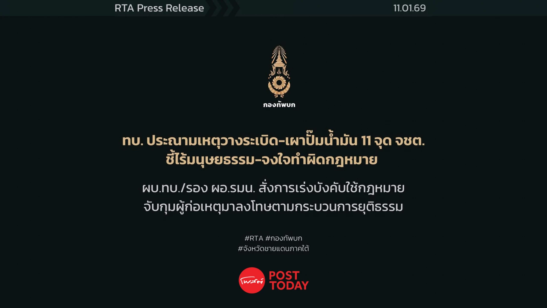 ตามที่เกิดเหตุการณ์ลอบวางระเบิดและวางเพลิงปั๊มน้ำมันรวม 11 จุด ในพื้นที่จังหวัดปัตตานี ยะลา และนราธิวาส เมื่อเวลาประมาณ 01.00 น. ของวันที่ 11 มกราคม 2569 ที่ผ่านมานั้น กองทัพบกขอประณามการกระทำอันไร้มนุษยธรรมของกลุ่มผู้ก่อเหตุรุนแรงดังกล่าว ซึ่งส่งผลกระทบโดยตรงต่อความปลอดภัยในชีวิต ทรัพย์สิน และระบบสาธารณูปโภคของพลเรือน ถือเป็นการมุ่งสร้างสถานการณ์ความรุนแรง ความหวาดกลัว และบ่อนทำลายความสงบสุขในพื้นที่