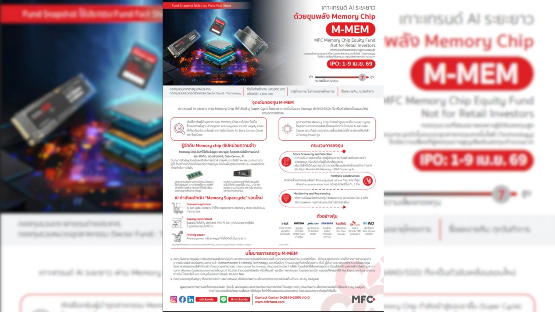 กองทุนเปิดเอ็มเอฟซี เมมโมรี่ ชิป อิควิตี้ ห้ามขายผู้ลงทุนรายย่อย (MFC Memory Chip Equity Fund Not for Retail Investors) หรือ "M-MEM" เปิดโอกาสให้นักลงทุนเข้าถึงธีมการเติบโตของ AI Infrastructure ผ่านหุ้นกลุ่ม Memory Chip ชั้นนำระดับโลก มีนโยบายการลงทุนในตราสารทุนและ/หรือหลักทรัพย์ที่เกี่ยวข้องกับตราสารทุนของบริษัทที่จดทะเบียนในตลาดหลักทรัพย์ต่างประเทศทั่วโลก ที่ดําเนินธุรกิจหรือมีรายได้จากการดําเนินธุรกิจจากเซมิคอนดักเตอร์และหน่วยความจํา (Semiconductor &Memory Technology) และ/หรืออื่นๆ ที่ครอบคลุมทั้งห่วงโซ่อุปทานเป็นอีกหนึ่งทางเลือกสำหรับผู้ลงทุนที่ต้องการ “เกาะเทรนด์ AI” ผ่านโครงสร้างพื้นฐานสำคัญของโลกดิจิทัลในอนาคต