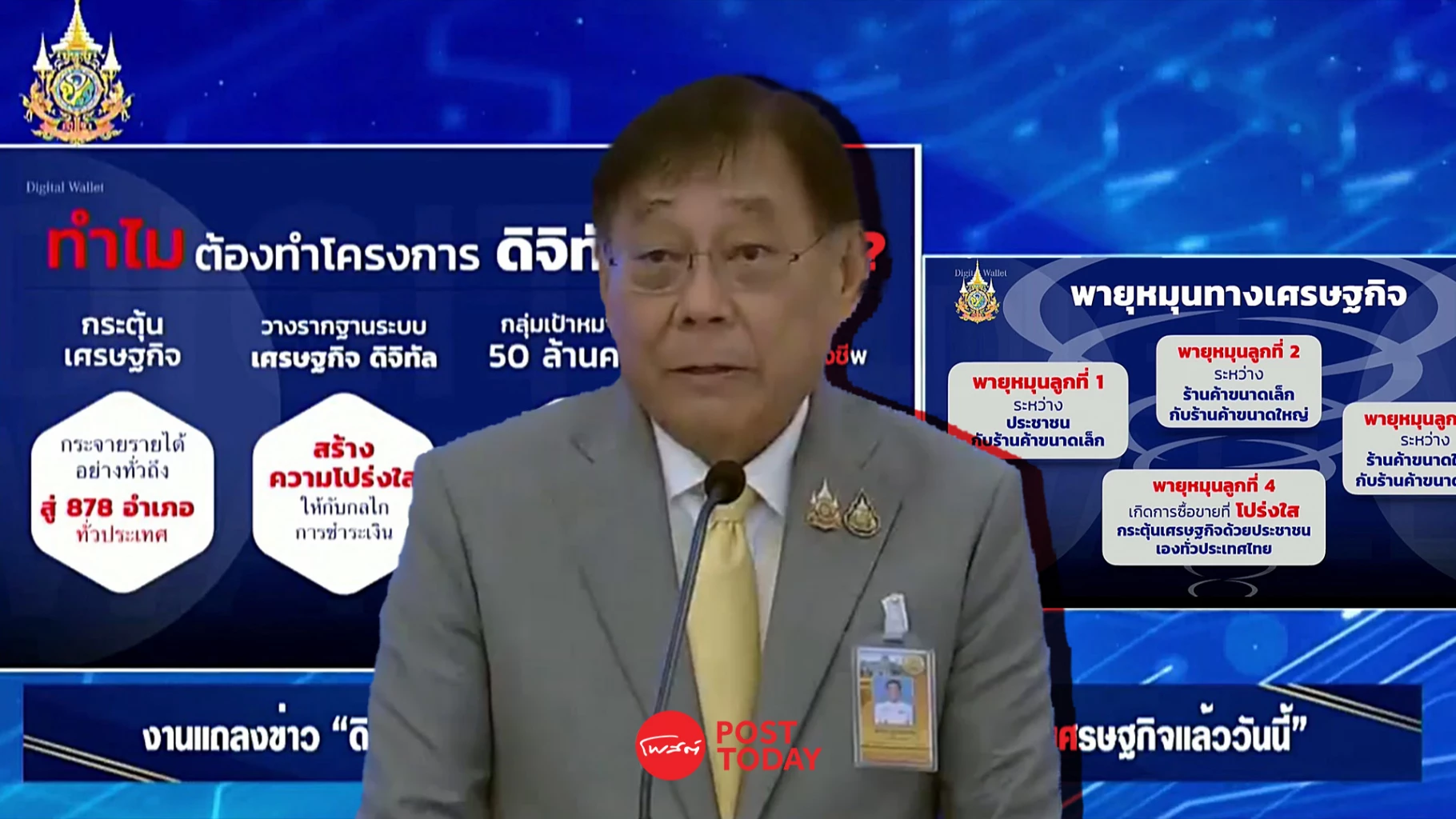 พิชัย ชุณหวชิร รองนายกรัฐมนตรีและรมว.คลัง แถลง ดิจิทัล วอลเล็ต โครงการเพื่อประชาชน หวังเกิดพายุหมุนทางเศรษฐกิจ4ลูก กระจายรายได้อย่างทั่วถึงไปสู่ระดับ878อำเภอทั่วประเทศ ครอบคลุมผู้ใช้สิทธิประมาณการ45ล้านคน