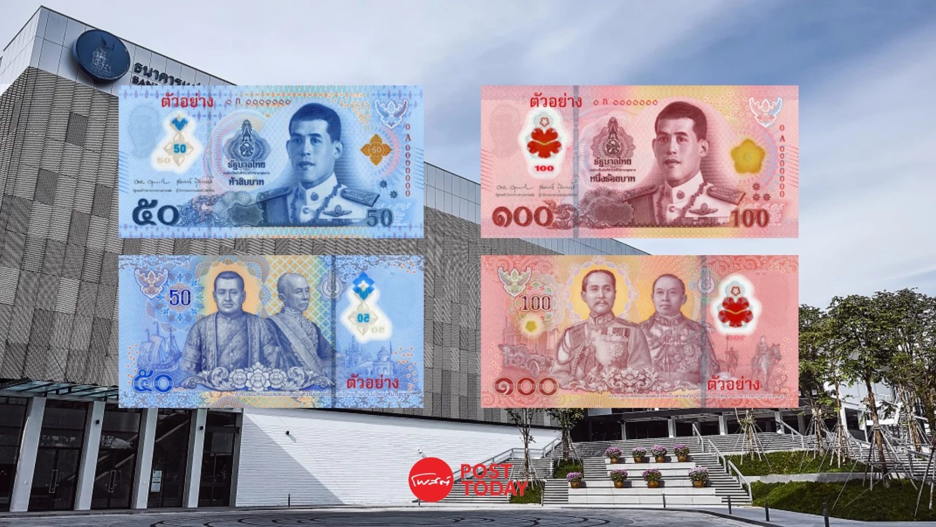 ธนบัตรพอลิเมอร์ชนิดราคา 50 บาท และ 100 บาท มีกำหนดออกใช้หมุนเวียนในวันที่ 21 พฤศจิกายน 2568 นี้ ประชาชนสามารถเบิกถอนผ่านธนาคารพาณิชย์และสถาบันการเงินเฉพาะกิจทุกแห่ง