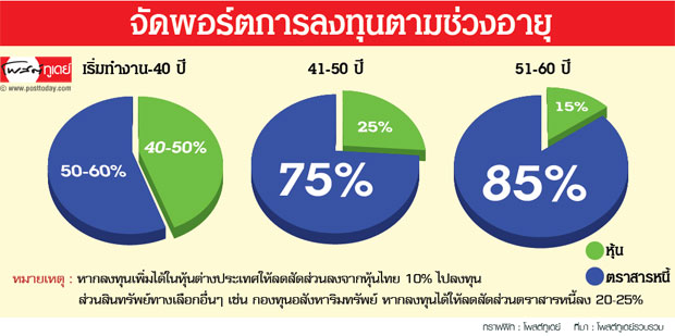 สำหรับการจัดพอร์ตการลงทุนตามช่วงอายุสำหรับผู้ที่เริ่มทำงานจนถึงอายุ 40 ปี แนะนำให้ลงทุนในหุ้นประมาณ 40-50% เนื่องจากยังมีอายุการทำงานได้อีกนานเกือบ 20-30 ปี และเฉลี่ยเศรษฐกิจค่อยๆ โตก็มีโอกาสหนุนดัชนีหุ้นปรับตัวขึ้นได้จากปัจจุบันอยู่ระดับ 1,370 จุด ส่วนการลงทุนอีกสัดส่วน 50-60% อยู่ในตราสารหนี้