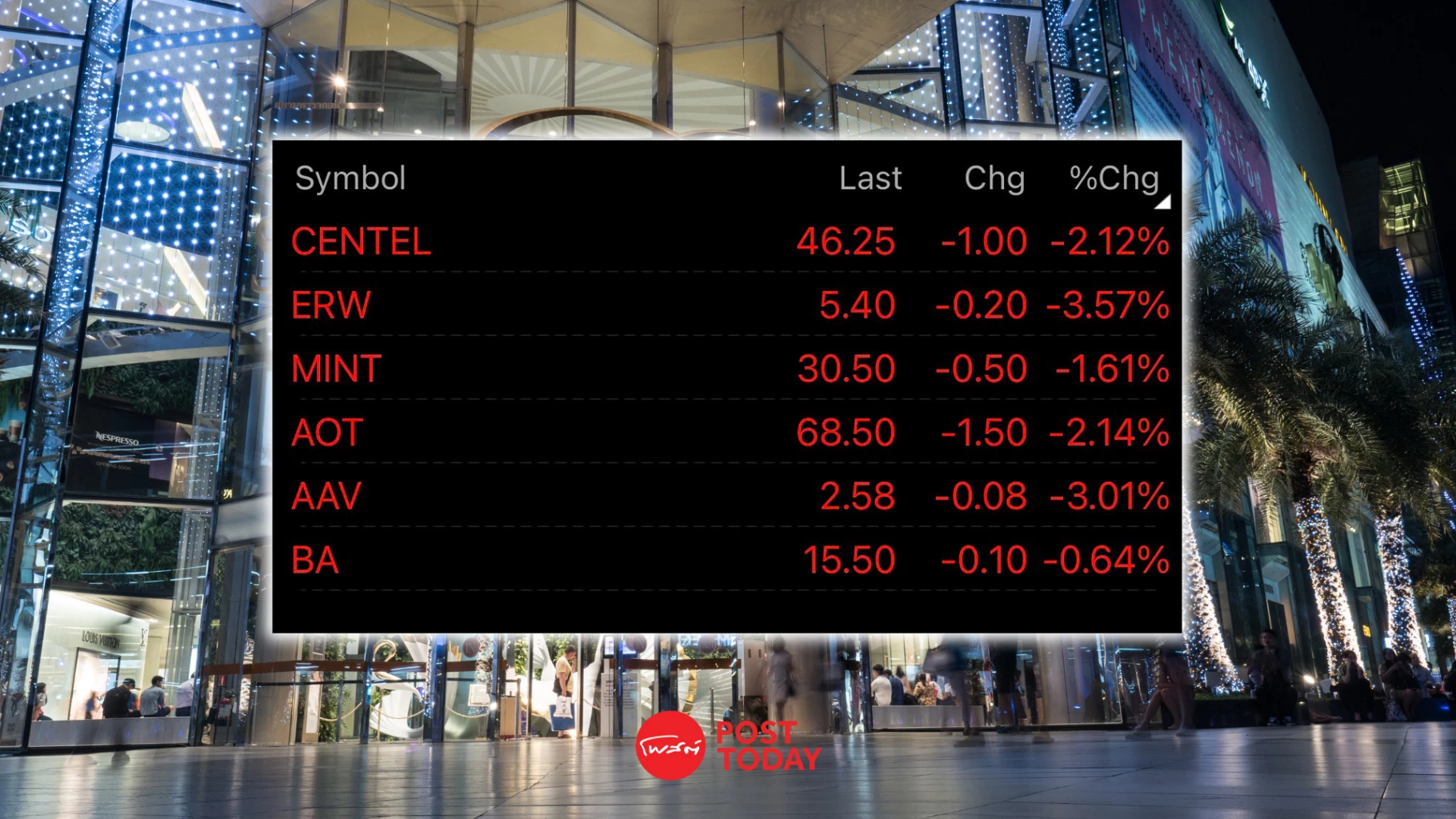 ผู้สื่อข่าวรายงานว่า ความเคลื่อนไหวราคาหุ้นกลุ่มท่องเที่ยว กลุ่มขนส่งและโลจิสติกส์ วันนี้ (4 ต.ค.) ปิดช่วงเช้า เวลา 12.30 น. ปรับตัวลดลง โดยเฉพาะ CENTEL ลดลง 2.12% ERW ลดลง 3.57% MINT ลดลง 1.61% AOT ลดลง 2.14% AAV ลดลง 3.01% BA ลดลง 0.67% หลังจากวานนี้ (3 ต.ค.) มีเหตุคนร้ายใช้อาวุธยิงกลางสยามพารากอน มีผู้เสียชีวิต 2 ราย (เป็นนักท่องเที่ยวชาวจีนหนึ่งรายและอีกคนเป็นชาวเมียนมา) และบาดเจ็บ 5 ราย