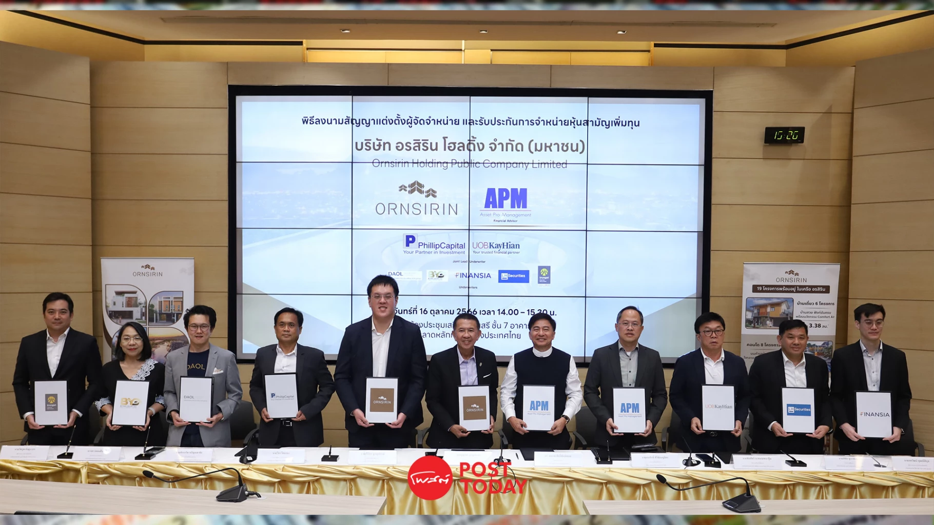 นายสมศักดิ์ ศิริชัยนฤมิตร ประธานเจ้าหน้าที่บริหาร บริษัท แอสเซท โปร แมเนจเม้นท์ จำกัด หรือ APM ในฐานะที่ปรึกษาทางการเงิน บริษัท อรสิริน โฮลดิ้ง จำกัด (มหาชน) หรือ ORN กล่าวว่า ORN ได้ลงนามในสัญญาแต่งตั้ง บริษัทหลักทรัพย์ ฟิลลิป (ประเทศไทย) จำกัด (มหาชน) และบริษัทหลักทรัพย์ ยูโอบี เคย์เฮียน (ประเทศไทย) จำกัด (มหาชน) เป็นผู้จัดการการจัดจำหน่ายและรับประกันการจำหน่ายร่วมของหุ้นสามัญเพิ่มทุน ให้กับประชาชนเป็นครั้งแรก (IPO)