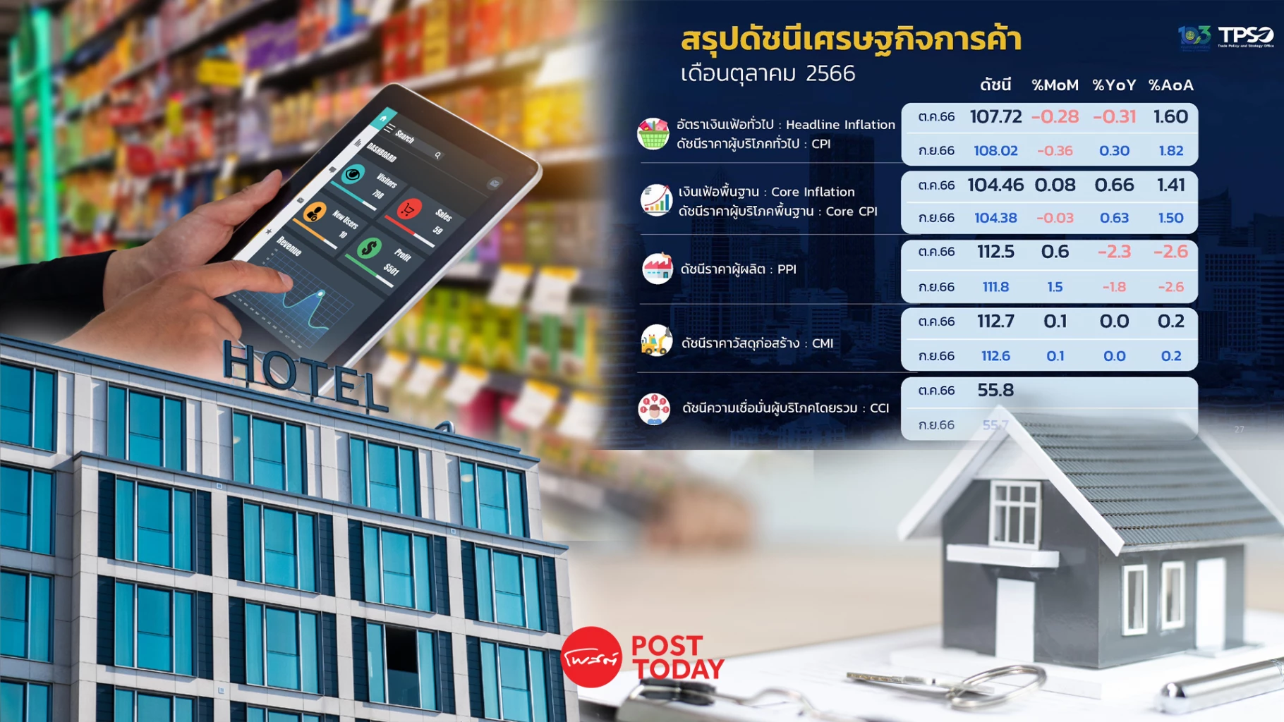 วันนี้ (6 พ.ย.) สำนักงานนโยบายและยุทธศาสตร์การค้า (สนค.) ประกศดัชนีราคาผู้บริโภคทั่วไป (CPI) เดือน ต.ค.2566 อยู่ที่ระดับ 107.72 ลดลง 0.31% จากช่วงเดียวกันปีก่อน และลดลง 0.28% จากเดือนก่อน ส่งผลให้อัตราเงินเฟ้อทั่วไปเฉลี่ย 10 เดือนแรกของปี 2566 เพิ่มขึ้น 1.60%