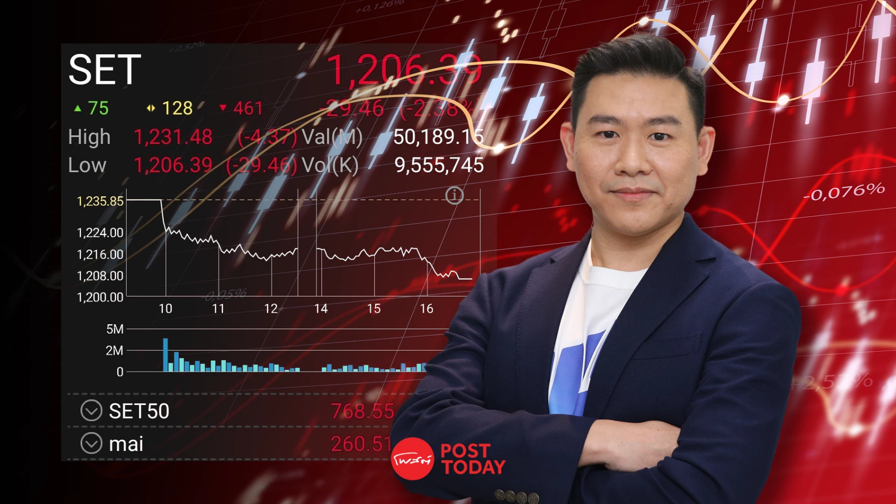 ตลาดหุ้นไทยเผชิญแรงขายอย่างหนัก! ความเคลื่อนไหวของดัชนีหุ้นปิดการซื้อขายวันนี้ (25 กุมภาพันธ์ 2568) ร่วงลง 29.46 จุด ปิดต่ำที่ระดับ 1,206.39 จุด คิดเป็น -2.38% ด้วยมูลค่าการซื้อขาย 50,189.15 ล้านบาท ระหว่างวันดัชนีปรับขึ้นสูงสุด 1,231.48 จุด และลดลงต่ำสุด 1,206.39 จุด