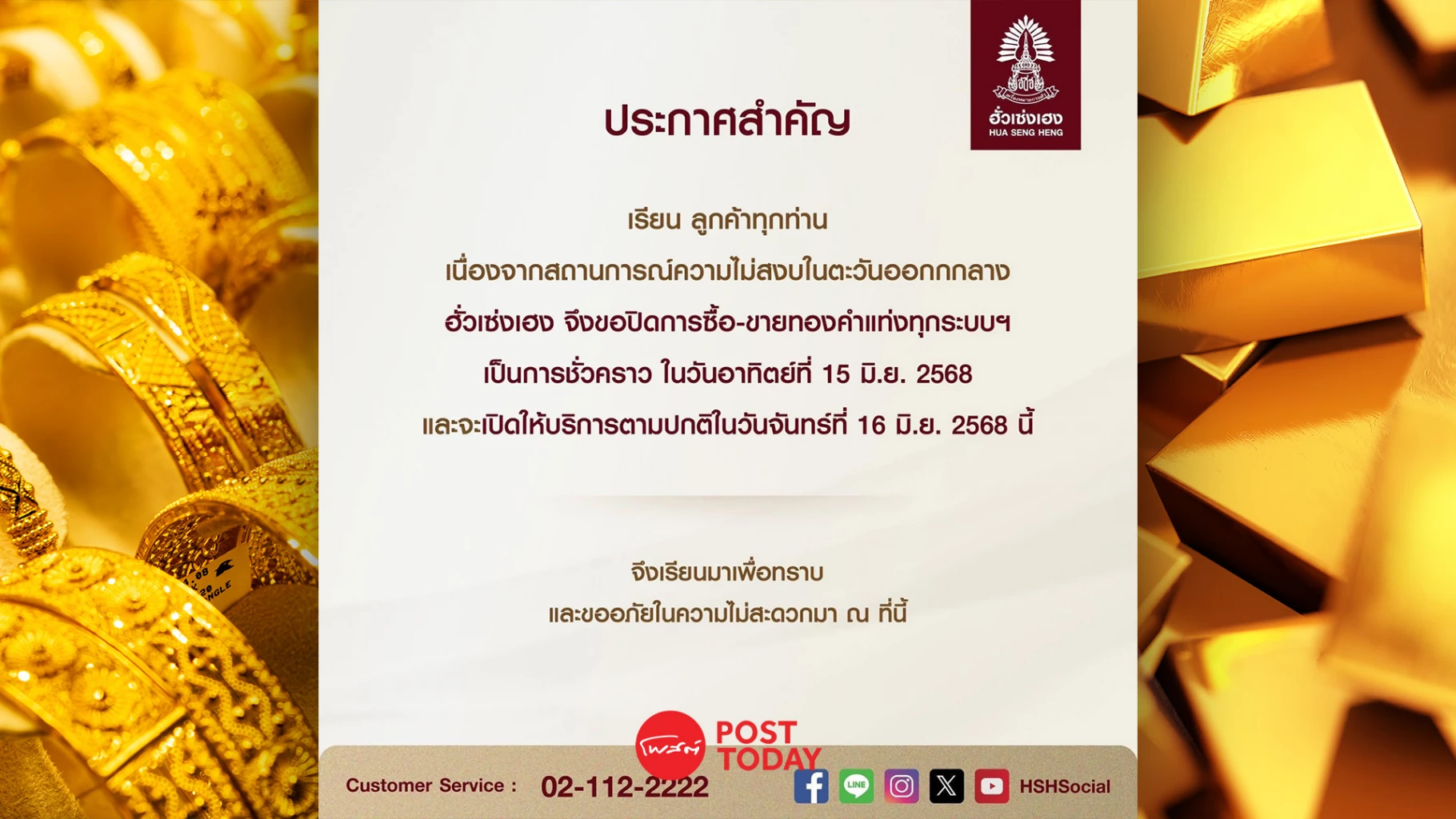 "ฮั่วเซ่งเฮง" หยุดซื้อขายทองคำ 15 มิ.ย. ชั่วคราว เหตุความไม่สงบในตะวันออกกลาง กลับมาเปิดตามปกติ 16 มิ.ย. ขณะที่ร้านทองอื่นยังให้บริการตามปกติ