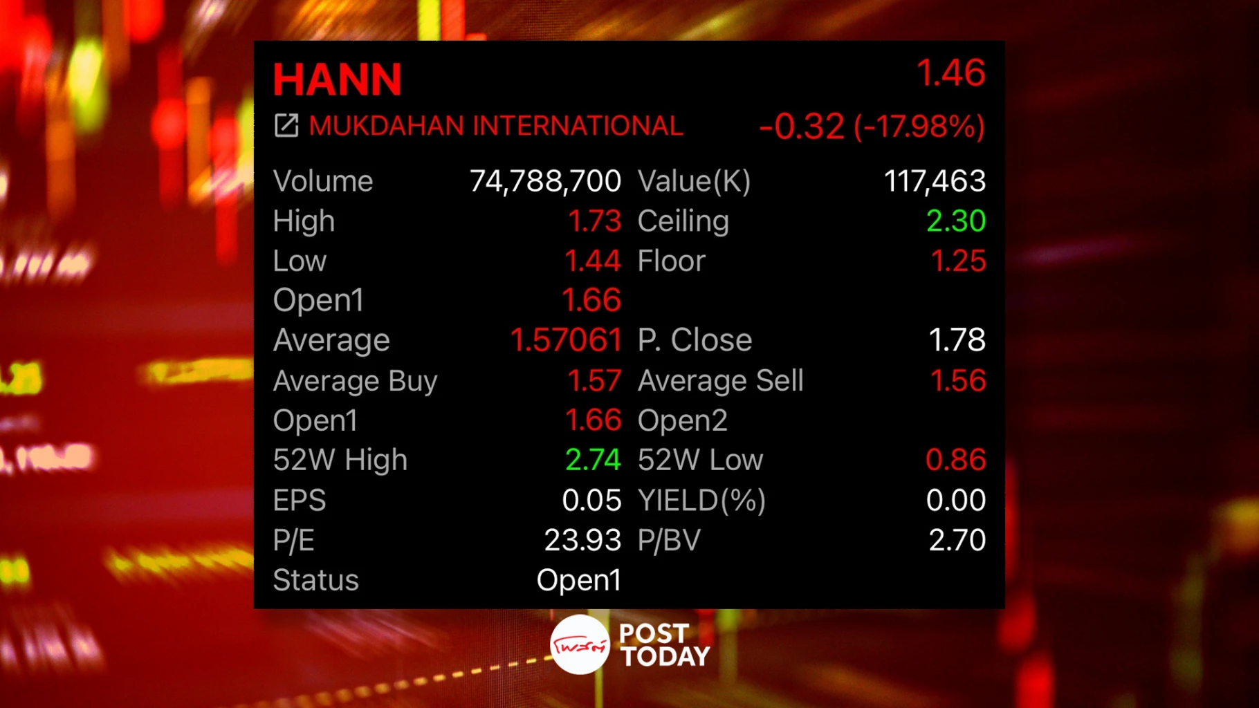- ล่าสุดราคาหุ้นร่วง 17.98% ต่อเนื่องเป็นวันที่ 2 มาอยู่ที่ 1.46 บาท/หุ้น ยังเหนือราคาไอพีโอที่ 0.70 บาท/หุ้น