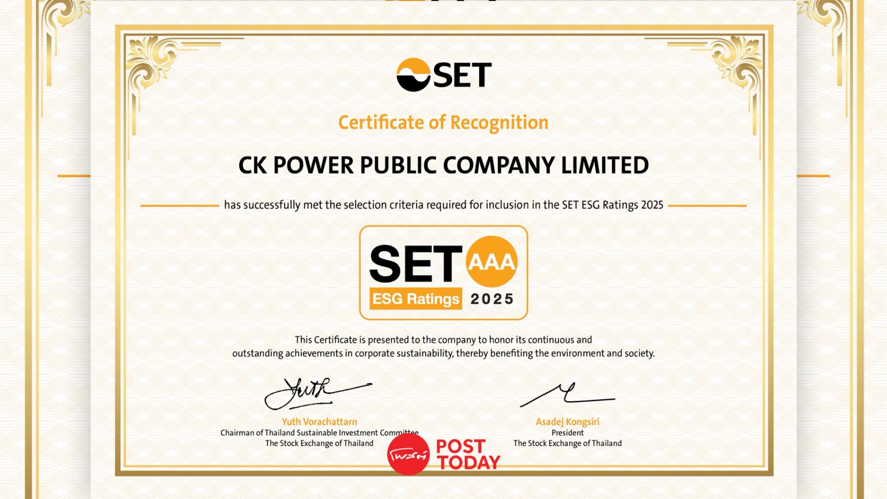 - บริษัท ซีเค พาวเวอร์ (CKP) ได้รับการประเมินหุ้นยั่งยืน SET ESG Ratings ประจำปี 2568 ในระดับสูงสุด AAA