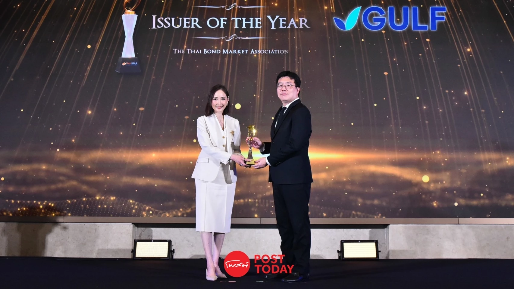 บริษัท กัลฟ์ ดีเวลลอปเมนท์ จำกัด (มหาชน) หรือ GULF นำโดย นางสาวยุพาพิน วังวิวัฒน์ ประธานเจ้าหน้าที่บริหารด้านการเงิน รับรางวัล Issuer of The Year จากงาน ThaiBMA Best Bond Awards 2025 ซึ่งจัดโดยสมาคมตลาดตราสารหนี้ไทย สะท้อนถึงบทบาทของ GULF ในการมีส่วนร่วมยกระดับมาตรฐานการระดมทุนในตลาดตราสารหนี้ของประเทศ โดยมี นายไพบูลย์ ดำรงวารี (ขวา) ผู้ช่วยเลขาธิการ สำนักงานคณะกรรมการกำกับหลักทรัพย์และตลาดหลักทรัพย์ (ก.ล.ต.) เป็นผู้มอบรางวัล ณ โรงแรมสยามเคมปินสกี้ กรุงเทพฯ