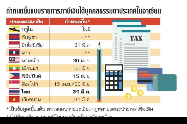 ในเรื่องของปีภาษีประเทศสมาชิกในอาเซียนกำหนดปีภาษีของบุคคลธรรมดาตามปีปฏิทิน กำหนดเวลาในการยื่นแบบอยู่ระหว่าง 3-6 เดือนหลังเดือน ธ.ค. ทั้งนี้กำหนดเวลายื่นภาษีของบุคคลในประเทศไทยของปี 2559 คือวันที่ 31 มี.ค. 2560 แต่ถ้ายื่น Online กำหนดเวลาจะขยายไปจนถึงวันที่ 10 เม.ย. 2560