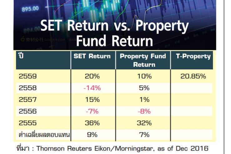 ซึ่ง บลจ.ธนชาตก็ออกกองทุนในลักษณะนี้ 2 กองทุน คือ T-Property และ T-PropInfraFlex ในส่วนของผลตอบแทนในช่วง 5 ปีที่ผ่านมา (ปี 2012-2016) กองทุนอสังหาริมทรัพย์ให้ผลตอบแทนเฉลี่ย 7% ต่อปี เทียบกับ SET Index ที่ให้ผลตอบแทนเฉลี่ยปีละ 9% ซึ่งผลตอบแทนที่ได้อยู่ในระดับที่ค่อนข้างสูงเมื่อเทียบกับอัตราดอกเบี้ยเงินฝาก และในปีที่ผ่านมากองทุนของ บลจ.ธนชาตเอง อย่าง T-Property ก็ทำผลงานได้น่าสนใจมากทีเดียว