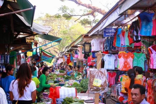 ขณะเดียวกันก็ยังมีตลาดสด ขนาดกลางๆ เช่น ที่อินเซ่งเซ อะโล่งเซ ตะยิ่นเซ เป็นต้น ส่วนตลาดเล็กๆ นั้นมีเยอะมากครับ บางครั้งพอมีที่ข้างถนนก็จะวางขายตรงนั้นเลยก็มี สินค้าก็จะมีคล้ายๆ กัน โดยตลาดรอบในของมหานครย่างกุ้ง ปัจจุบันนี้ได้เปลี่ยนไปเยอะมาก เพราะอิทธิพลของตลาดแบบโมเดิร์นเทรดเข้ามาสู่เมียนมา แต่ถ้าเป็นตลาดรอบนอกที่ไกลออกไปนิดมักจะเป็นรูปแบบคล้ายๆ กัน คือด้านหน้าจะเป็นอาคารคอนกรีต 2 ชั้น โดยร้านค้าที่ด้านหน้าจะขายสินค้าอุปโภค-บริโภค และสินค้าประเภทสังฆภัณฑ์ ด้านในจะเป็นอาคารชั้นเดียว เป็นอาคารสังกะสีสูงๆ เหมือนศาลาวัด ร้อนมากๆ ด้านหน้าจะเป็นการขายเสื้อผ้าและรองเท้า อาหารแห้ง ขนมนมเนย สินค้าอาหารกระป๋อง เป็นต้น จากนั้นแถวถัดไปก็จะเป็นจำพวกเครื่องสำอางและสินค้าประเภทของใช้ในบ้าน แถวถัดไปก็จะเป็นอาหารสดต่างๆ เช่น ผลไม้ พืชผักต่างๆ จะตั้งแถวยาวเลยครับ เลือกซื้อหากันสนุกเลย