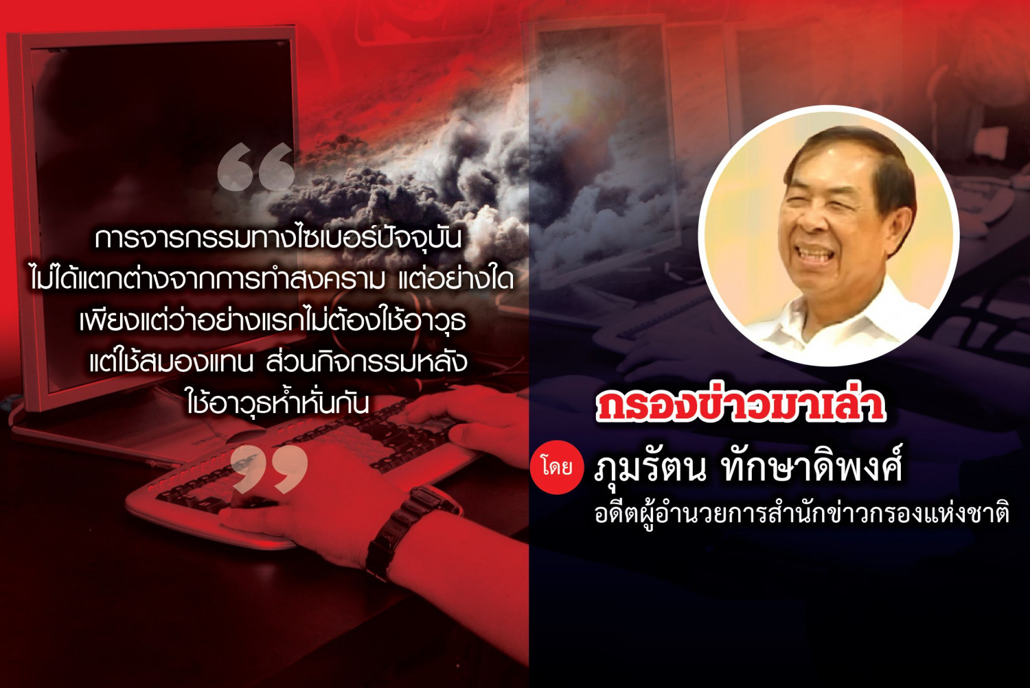 เวลานี้เทคโนโลยีข่าวสาร หรือ ไอที ก้าวหน้ารวดเร็วเกินคาด ใครจะค้นอะไรก็ค้นในคอมพิวเตอร์ ในโทรศัพท์มือถือ เวลาเก็บข้อมูลก็เก็บไว้ในคอมพิวเตอร์ตั้งโต๊ะซึ่งเก็บได้มาก หรือเก็บไว้ในไอแพด โน๊ตบุ๊ค โทรศัพท์มือถือ หากมีข้อมูลมากก็เก็บไว้ในเครื่องขนาดใหญ่ หากจำเป็นต้องเอาติดตัวไปก็ก็อปปี้ลงในทัมบ์ไดร์ฟที่เอาติดตัวไปไหนก็ได้ แต่ถ้าเป็นข้อมูลลับทางราชการ จะเป็นความลับระดับไหนก็ตามต้องมีมาตรการในการคุ้มครองป้องกันไม่ให้ใครเจาะเข้ามาโดยที่เราไม่รู้ตัว การข่าวกรองก็ต้องปรับตัวเองเป็น “ข่าวกรองทางไซเบอร์”