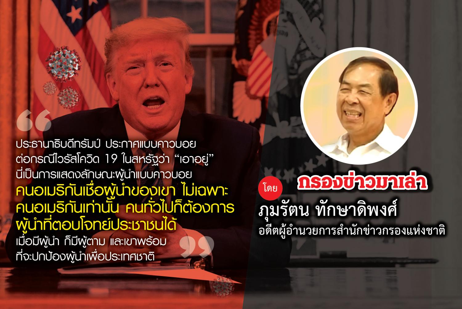 ประธานาธิบดีทรัมป์ ประกาศแบบคาวบอยต่อกรณีไวรัสโควิด 19 ในสหรัฐว่า “เอาอยู่” นี่เป็นการแสดงลักษณะผู้นำแบบคาวบอย คนอเมริกันเชื่อผู้นำของเขา ไม่เฉพาะคนอเมริกันเท่านั้น คนทั่วไปก็ต้องการผู้นำที่ตอบโจทย์ประชาชนได้ เมื่อมีผู้นำ ก็มีผู้ตาม และเขาพร้อมที่จะปกป้องผู้นำเพื่อประเทศชาติ