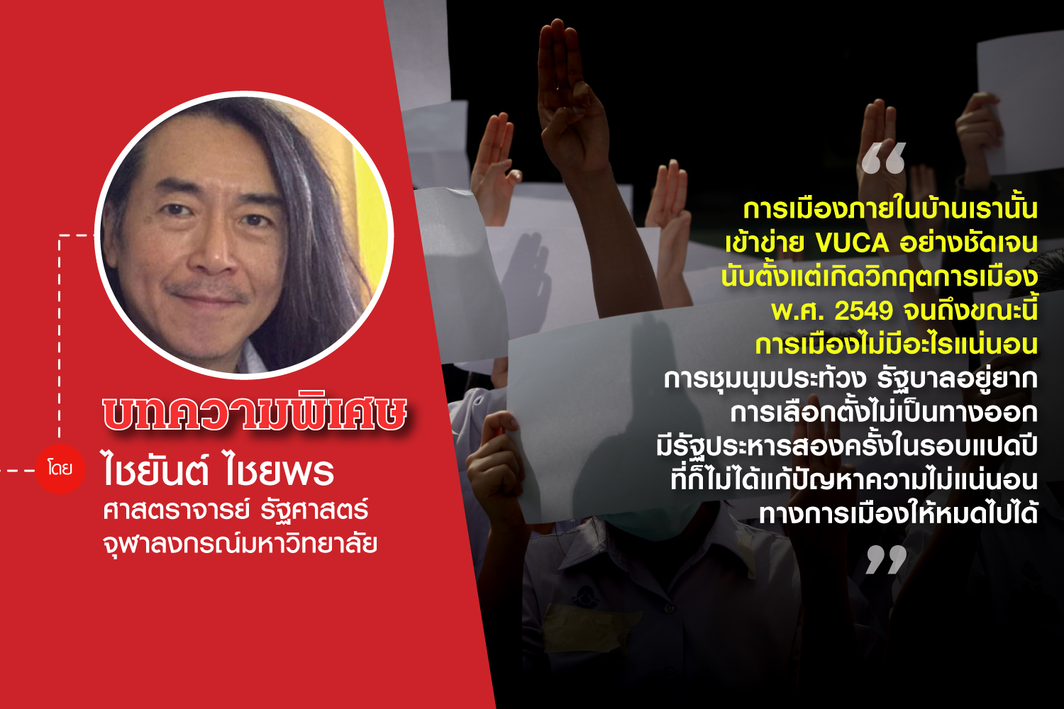 และที่สำคัญที่สุดคือ การเมืองภายในบ้านเรานั้นเข้าข่าย VUCA อย่างชัดเจน นับตั้งแต่เกิดวิกฤตการเมือง พ.ศ. 2549 จนถึงขณะนี้ การเมืองไม่มีอะไรแน่นอน การชุมนุมประท้วง รัฐบาลอยู่ยาก การเลือกตั้งไม่เป็นทางออก มีรัฐประหารสองครั้งในรอบแปดปี คือ ระหว่าง พ.ศ. 2549-2557 ที่ก็ไม่ได้แก้ปัญหาความไม่แน่นอนทางการเมืองให้หมดไปได้ และเมื่อการเมืองไม่นิ่ง เศรษฐกิจก็พลอยระส่ำ ยิ่งถูกผลกระทบจากสิ่งที่เหนือความคาดเดาอย่างการระบาดของ Covid-19 ก็ยิ่งส่งผลกระทบต่อการใช้ชีวิตทางสังคมที่ไม่รู้ว่าอนาคตตัวเองจะเป็นอย่างไร ในสภาพที่โลกข้างนอกก็เป็น VUCA และโลกข้างในก็ยังเป็น VUCA อีก