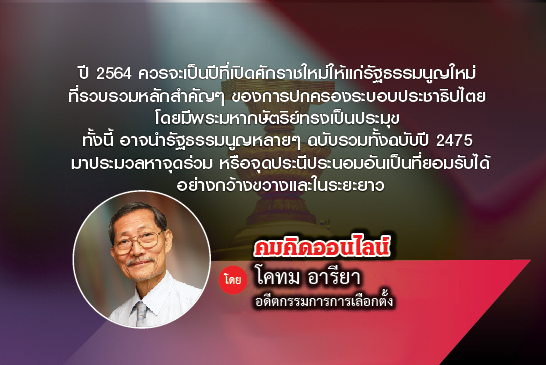 ปี 2564 ควรจะเป็นปีที่เปิดศักราชใหม่ให้แก่รัฐธรรมนูญใหม่ ที่รวบรวมหลักสำคัญ ๆ ของการปกครองระบอบประชาธิปไตย โดยมีพระมหากษัตริย์ทรงเป็นประมุข ทั้งนี้ อาจนำรัฐธรรมนูญหลาย ๆ ฉบับรวมทั้งฉบับปี 2475 มาประมวลหาจุดร่วม หรือจุดประนีประนอมอันเป็นที่ยอมรับได้อย่างกว้างขวางและในระยะยาว มิฉะนั้น ปี 2564 อาจเป็นเพียงอีกจังหวะหนึ่งของการดึงไปดันมา แล้วแต่กระแสและประโยชน์ระยะสั้นจะพาไป