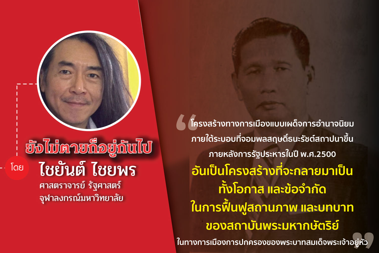 “การเมืองแบบเผด็จการอำนาจนิยมภายใต้ระบอบที่จอมพลสฤษดิ์ธนะรัชต์ สถาปนาขึ้นภายหลังการรัฐประหารในปี พ.ศ.2500 อันเป็นโครงสร้างที่จะกลายมาเป็นทั้งโอกาสและข้อจำกัด ในการฟื้นฟูสถานภาพและบทบาทของสถาบันพระมหากษัตริย์ในทางการเมืองการปกครองของพระบาทสมเด็จพระเจ้าอยู่หัว”