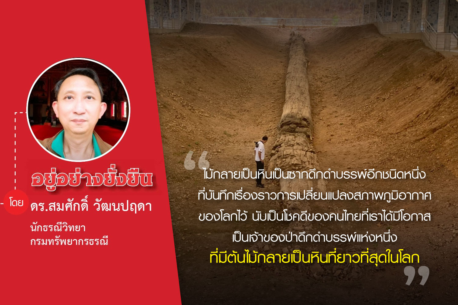 มนุษย์เกิดและอาศัยอยู่ในโลกนี้ในช่วงเวลาที่น้อยนิดเมื่อเทียบกับอายุของโลก และสิ่งมีชีวิตอื่นที่เคยครองโลกมาก่อน ซากดึกดำบรรพ์หลายชนิดที่พบปรากฎในประเทศไทย ทั้งซากไดโนเสาร์ สัตว์ทะเลขนาดเล็ก รวมถึงสิ่งที่คงเหลืออยู่ของพืชดึกดำบรรพ์ ล้วนเป็นสิ่งที่บ่งบอกวิวัฒนาการของโลกทั้งสิ้น ไม้กลายเป็นหินเป็นซากดึกดำบรรพ์อีกชนิดหนึ่งที่บันทึกเรื่องราวการเปลี่ยนแปลงสภาพภูมิอากาศของโลกไว้ นับเป็นโชคดีของคนไทยที่เราได้มีโอกาสเป็นเจ้าของป่าดึกดำบรรพ์แห่งหนึ่ง ที่มีต้นไม้กลายเป็นหินที่ยาวที่สุดในโลก ที่ถูกค้นพบเมื่อ 18 ปีที่แล้ว ณ อุทยานแห่งชาติดอยสอยมาลัย จังหวัดตาก ไม้กลายเป็นหินต้นที่ 1 ที่ถูกค้นพบเมื่อปี พ.ศ. 2546 และมีความยาวถึง 72.22 เมตร เทียบเท่าตึก 20 ชั้น ซึ่งสูงกว่าภูเขาทอง วัดสระเกศ ซึ่งมีความสูง 59 เมตร และต่ำกว่าพระปรางค์วัดอรุณที่มีความสูง 82 เมตร เพียง 10 เมตร ไม้กลายเป็นหินต้นที่ 1 ดังกล่าวนั้น เป็นต้นทองบึ้ง ซึ่งไม่พบในภาคเหนือของไทยในปัจจุบัน แต่พบในพื้นที่ป่าดิบชื้นในพื้นที่ภาคใต้ของประเทศไทย และคาบสมุทรมลายู ซึ่งแสดงถึงการเปลี่ยนแปลงของสภาพภูมิอากาศของประเทศไทยในช่วงกว่า 120,000 ปีที่ผ่านมา ที่ป่าดึกดำบรรรพ์แห่งนี้เคยยึดครองพื้นที่จังหวัดตากเมื่อในอดีต