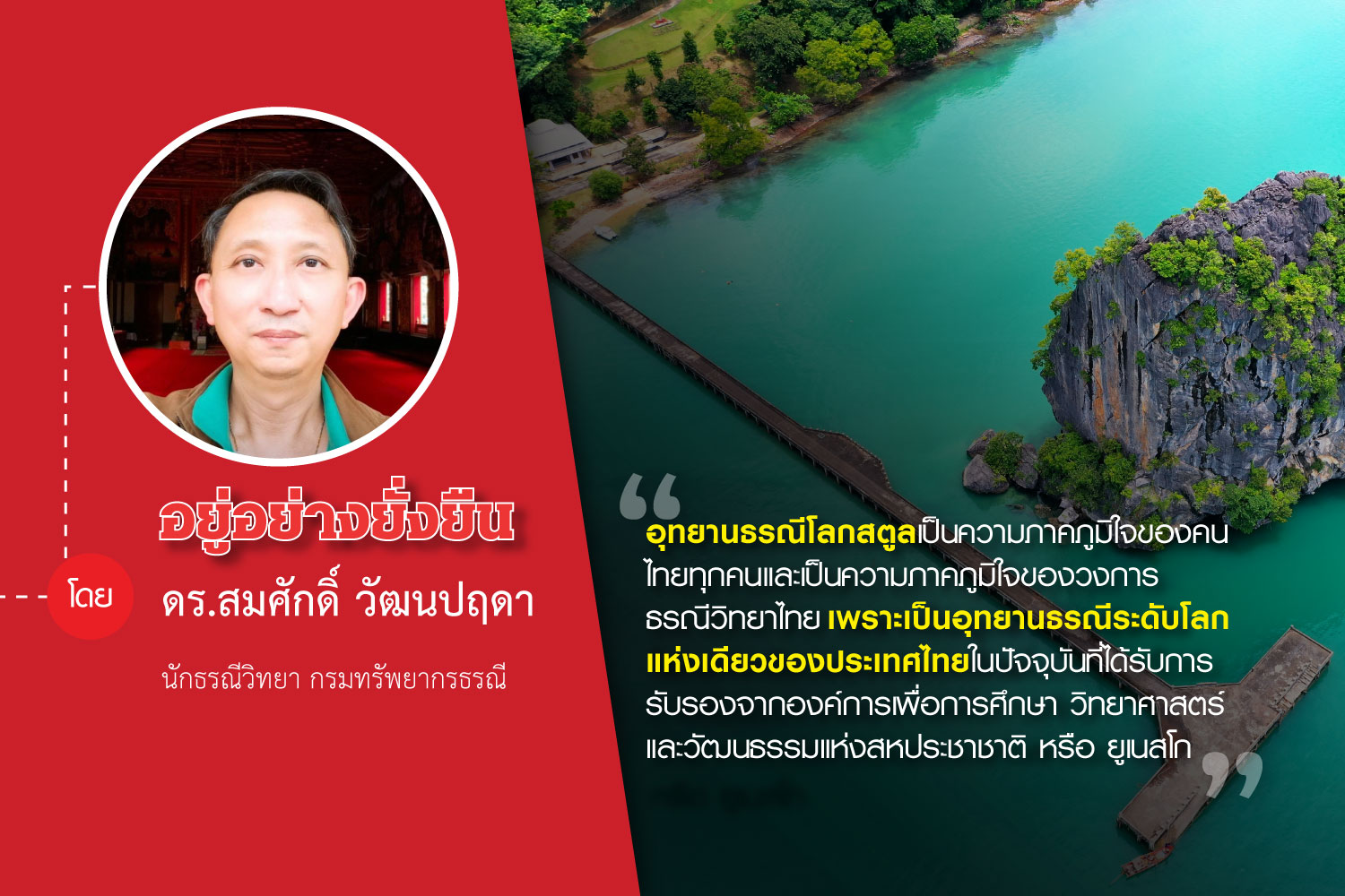 อุทยานธรณีโลกสตูล (Satun UNESCO Global Geopark) เป็นความภาคภูมิใจของคนไทยทุกคนและเป็นความภาคภูมิใจของวงการธรณีวิทยาไทย เพราะเป็นอุทยานธรณีระดับโลกแห่งเดียวของประเทศไทยในปัจจุบันที่ได้รับการรับรองจากองค์การเพื่อการศึกษา วิทยาศาสตร์ และวัฒนธรรมแห่งสหประชาชาติ หรือ ยูเนสโก (The United Nations Educational, Scientific and Cultural Organization: UNESCO) จากจำนวนอุทยานธรณีระดับโลกทั้งสิ้น 147 แห่งทั่วโลก โดยประชาชนจังหวัดสตูลและองค์กรปกครองส่วนท้องถิ่นร่วมกับจังหวัดสตูล โดยมีกรมทรัพยากรธรณีร่วมสนับสนุนข้อมูลและผลงานวิจัยทางวิชาการ ในการพัฒนาอุทยานธรณีสตูลเป็นอุทยานธรณีโลกแห่งแรกของประเทศไทย และยังคงผลักดันอย่างต่อเนื่องเพื่อให้เกิดการท่องเที่ยวเชิงสร้างสรรค์ เกิดการพัฒนาให้อุทยานธรณีเป็นศูนย์กลางการเผยแพร่องค์ความรู้และเชื่อมโยงแหล่งมรดกธรณีวิทยาในพื้นที่ ส่งเสริมให้เกิดการท่องเที่ยวที่สนับสนุนการมีส่วนร่วมของชุมชนและหน่วยงานท้องถิ่น เกิดการกระตุ้นกิจกรรมทางเศรษฐกิจและการพัฒนาที่ยั่งยืนและสร้างรายได้ให้แก่ชุมชนผ่านการท่องเที่ยวแหล่งธรรมชาติในพื้นที่อุทยานธรณี