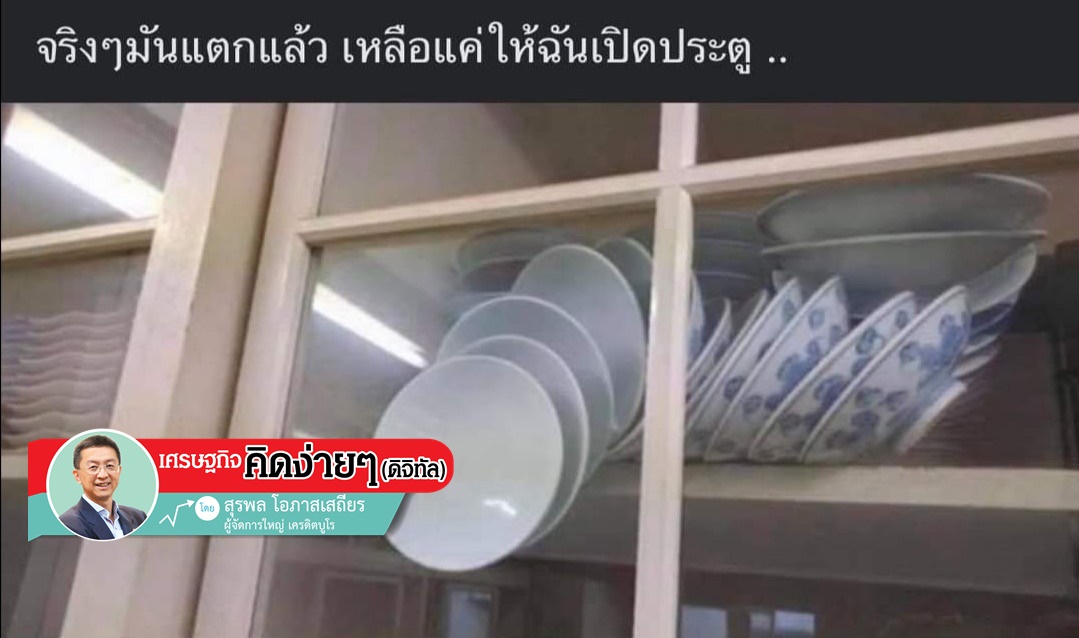 2. ภาพเดียวกันนี้สะท้อนในบทสนทนาที่น่าสนใจมาก มันมีการตั้งคำถามว่า ถ้าจานชามที่รอวันร่วงลงมาเมื่อเวลาเปิดประตูตู้เก็บคือบัญชีสินเชื่อ SME?s ที่กำลังสะบักสะบอมในเวลานี้ กำลังเอาตัวรอดในเวลานี้ โดยความจริงแล้วคือบางส่วนเป็น NPL ไปแล้ว แต่ด้วยมาตรการผ่อนผันผ่อนปรนบนเงื่อนไขทางบัญชี ทางปฏิบัติ มันเลยยังไม่ถูกนับว่าเป็น เมื่อไหร่เปิดบานประตูกลับไปมาตรฐานเดิมล่ะก็ มันคงร่วงลงมาแบบหยิบจับไม่ทัน คำถามคือทางแก้ ทางเตรียมตัว ทางที่จะลดผลกระทบให้จานชามแตกน้อยที่สุด หล่นไปจำนวนที่พอรับได้จะทำแบบไหนอย่างไร ก็มีคนออกมาให้ความเห็นเชิงแซะนิด ๆ ว่าที่ทำกันก็คือคิดทางแก้แบบวกไปเวียนมา ต้นทุนแพง น้อยเกินไป ช้าเกินไป ยังไม่โดนอะไรประมาณนั้น ข้อความที่แซะในเชิงเปรียบเทียบในการแก้ปัญหาจานชามไม่ให้เสียหายจากการเปิดตู้ท่านเขียนไว้ว่า "... รื้อหลังคาบ้านออกก่อน โหนสลิงลงมาแล้วเจาะเพดานบ้านชั้นสองลงมาชั้นล่าง หลังจากนั้น ทุบเพดานที่ติดกับห้องครัวออกให้หมดจนไปถึงตู้นี้ ค่อย ๆ เปิดแล้วเอื้อมมือไปหยิบชามนั้นออกมาจากตู้ครับ..."