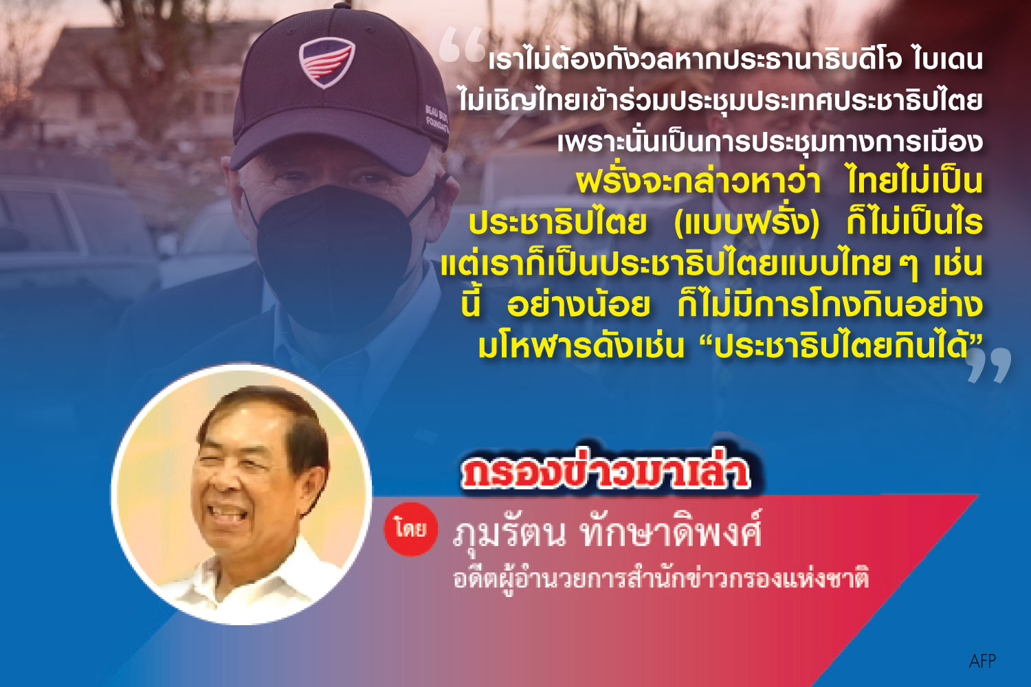 ดังนั้น เราไม่ต้องกังวลหากประธานาธิบดีโจ ไบเดน ไม่เชิญไทยเข้าร่วมประชุมประเทศประชาธิปไตย เพราะนั่นเป็นการประชุมทางการเมือง ฝรั่งจะกล่าวหาว่า ไทยไม่เป็นประชาธิปไตย (แบบฝรั่ง) ก็ไม่เป็นไร แต่เราก็เป็นประชาธิปไตยแบบไทย ๆ เช่นนี้ อย่างน้อย ก็ไม่มีการโกงกินอย่างมโหฬารดังเช่น “ประชาธิปไตยกินได้”