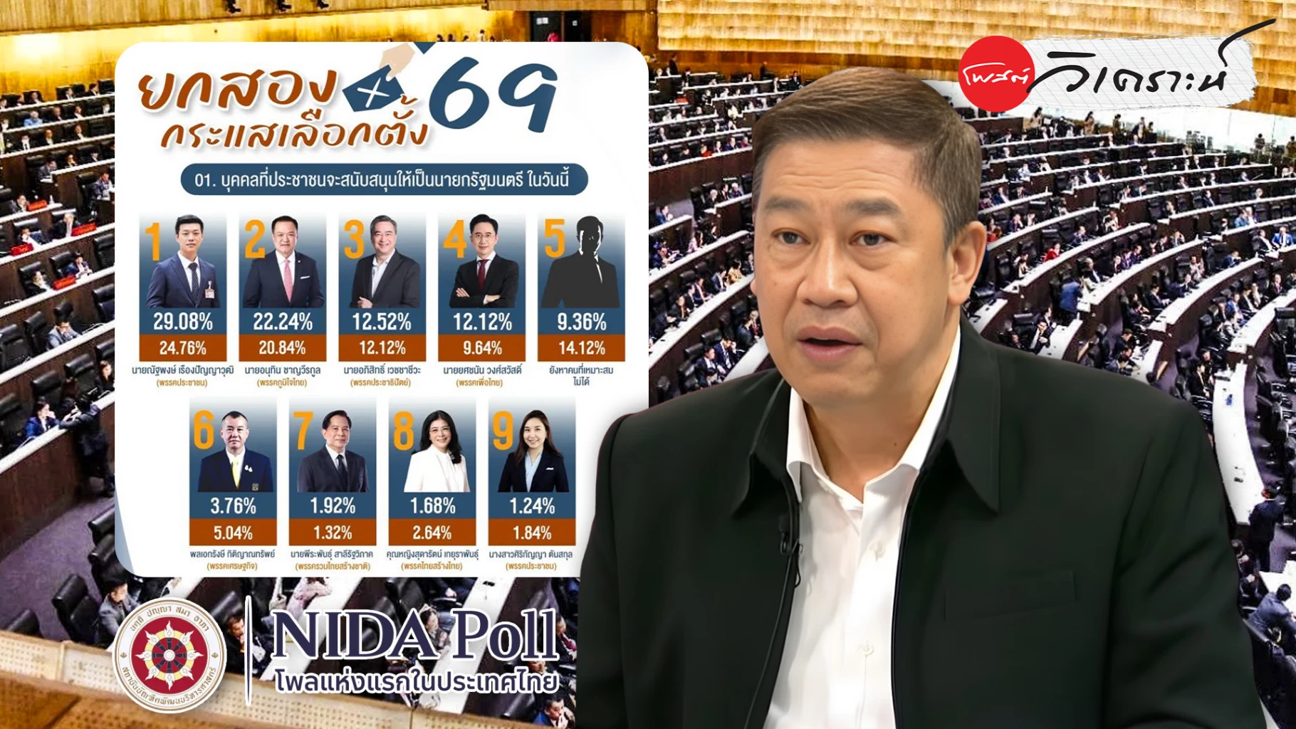 ผศ.ดร.สุวิชา เป้าอารีย์ ผู้อำนวยการศูนย์สำรวจความคิดเห็น "นิด้าโพล" ขยายภาพผลโพลยกสองของ นิด้าโพล เอกซเรย์โครงสร้างอำนาจที่กำลังก่อตัว ก่อนประเทศเข้าสู่ช่วง Blackout ตามกฎหมายเลือกตั้ง เมื่อผู้ลังเลใจเหลือเพียง 1–2% ตัวเลขทุกจุดจึงสะท้อน “การตัดสินใจจริง” มากกว่าอารมณ์ชั่ววูบ