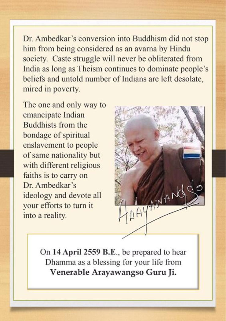 เจริญพรสาธุชนผู้มีศรัทธามั่นคงในพระพุทธศาสนา เมื่อไม่กี่วันที่ผ่านมาได้รับจดหมายจาก “The People’s Improvement Trust” ซึ่งก่อตั้งขึ้นเมื่อ พ.ศ. ๒๔๘๑ โดย ดร.บี อาร์ อัมเบดการ์ นักต่อสู้เพื่อสิทธิมนุษยชนผู้ยิ่งใหญ่ที่ชาวอินเดียไม่เคยลืมเลือน
