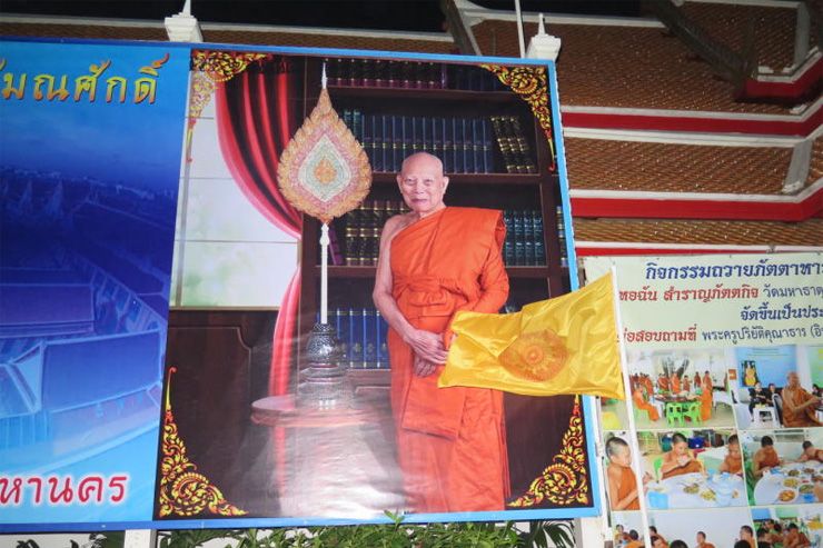 วัดมหาธาตุ ท่าพระจันทร์ ขึ้นคัตเอาต์แผ่นใหญ่ที่วิหารคด เพื่อประชาสัมพันธ์พิธีสมโภชหิรัญบัฏ พร้อมเครื่องประกอบสมณศักดิ์ของ พระธรรมปัญญาบดี (พีร์ สุชาตมหาเถร ป.ธ.5 M.A) อธิบดีสงฆ์วัดมหาธาตุยุวราชรังสสฤษฎิ์ นายกสภามหาวิทยาลัยมหาจุฬาลงกรณราชวิทยาลัย และที่ปรึกษาเจ้าคณะกรุงเทพมหานคร วันที่ 21-22 มี.ค. 2560 ณ พระอุโบสถวัดมหาธาตุ กรุงเทพมหานคร