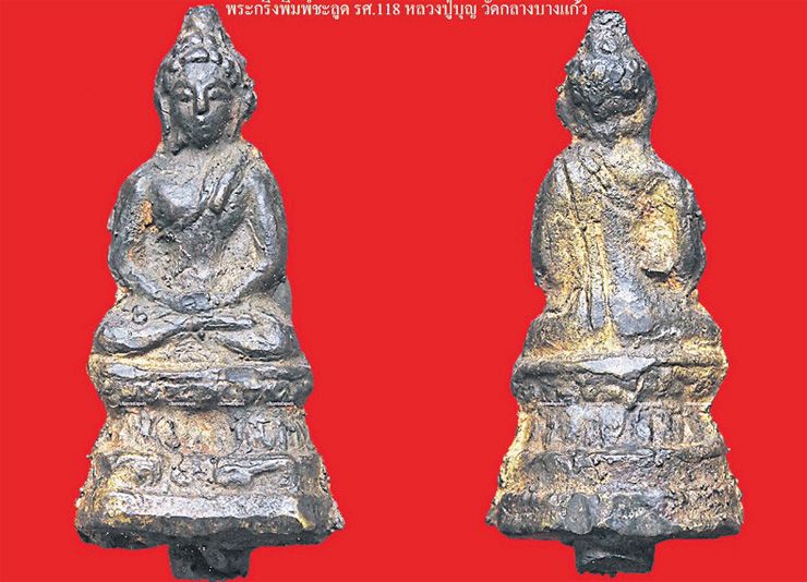 องค์แรก ชมพระกริ่งพิมพ์ชะลูด ร.ศ.118 หลวงปู่บุญ วัดกลางบางแก้ว พระชัยวัฒน์หลวงปู่บุญ วัดกลางบางแก้วพิมพ์ ร.ศ.118 เหตุที่เรียกเพราะการหล่อพระในแต่ละช่อนั้นจะมีเพียงองค์เดียวที่อยู่ยอดช่อและมีตัวอักษรบนพระชัยยอดช่อว่า ร.ศ.118 ซึ่งคือปี พ.ศ. 2441เป็นปีที่สร้าง องค์นี้กระแสโลหะจัดจ้านดูง่าย ราคาว่ากันหลักล้าน เป็นของคุณภูวเมศฐ์ ธีรตันติเกียรติ