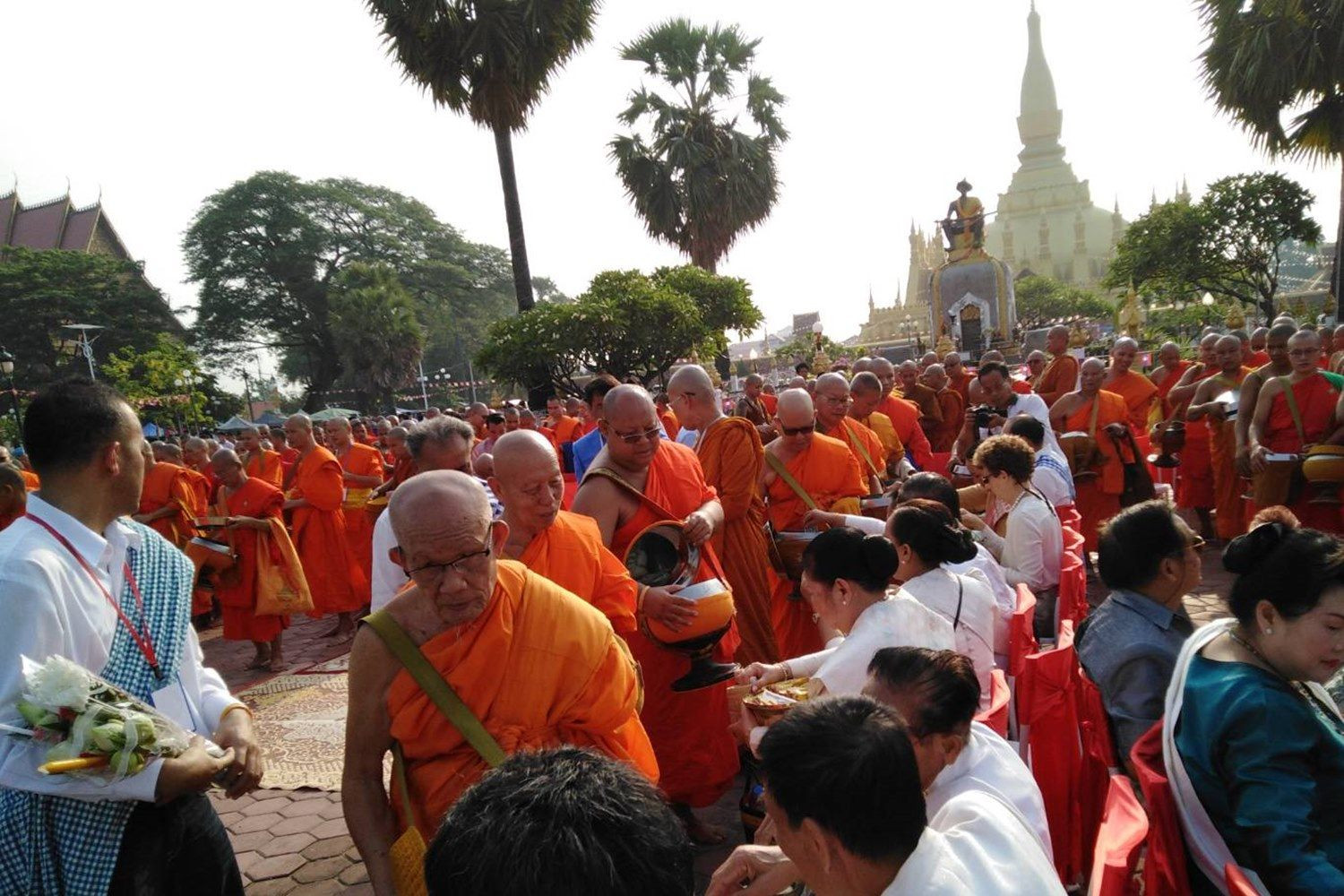 แต่การตักบาตรพระสงฆ์ นับพันรูป และชาวพุทธไม่น้อยกว่าพันคน พร้อมกันร่วมทำบุญตักบาตร ที่ลานกว้างใหญ่แห่งพระธาตุหลวง นครหลวงเวียงจันทร์ ไม่มีให้เห็นบ่อยนัก หากแต่มีแล้วในวันวิสาขบูชา วันที่ 18 พ.ค.2562 เมื่อรัฐบาล สปป.ลาว นำโดย ท่านชัยสมพร พรมวิหาร ประธานศูนย์กลางแนวลาวสร้างชาติ และคณะสงฆ์แห่งองค์การศาสนสัมพันธ์ลาว (อพส.) นำโดย ท่าน อาจารย์ใหญ่มหางอน ดำลงบุน